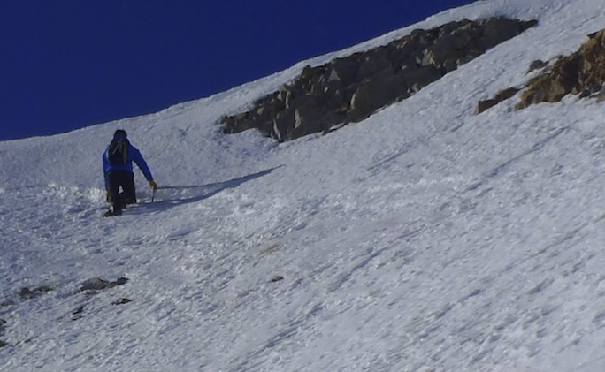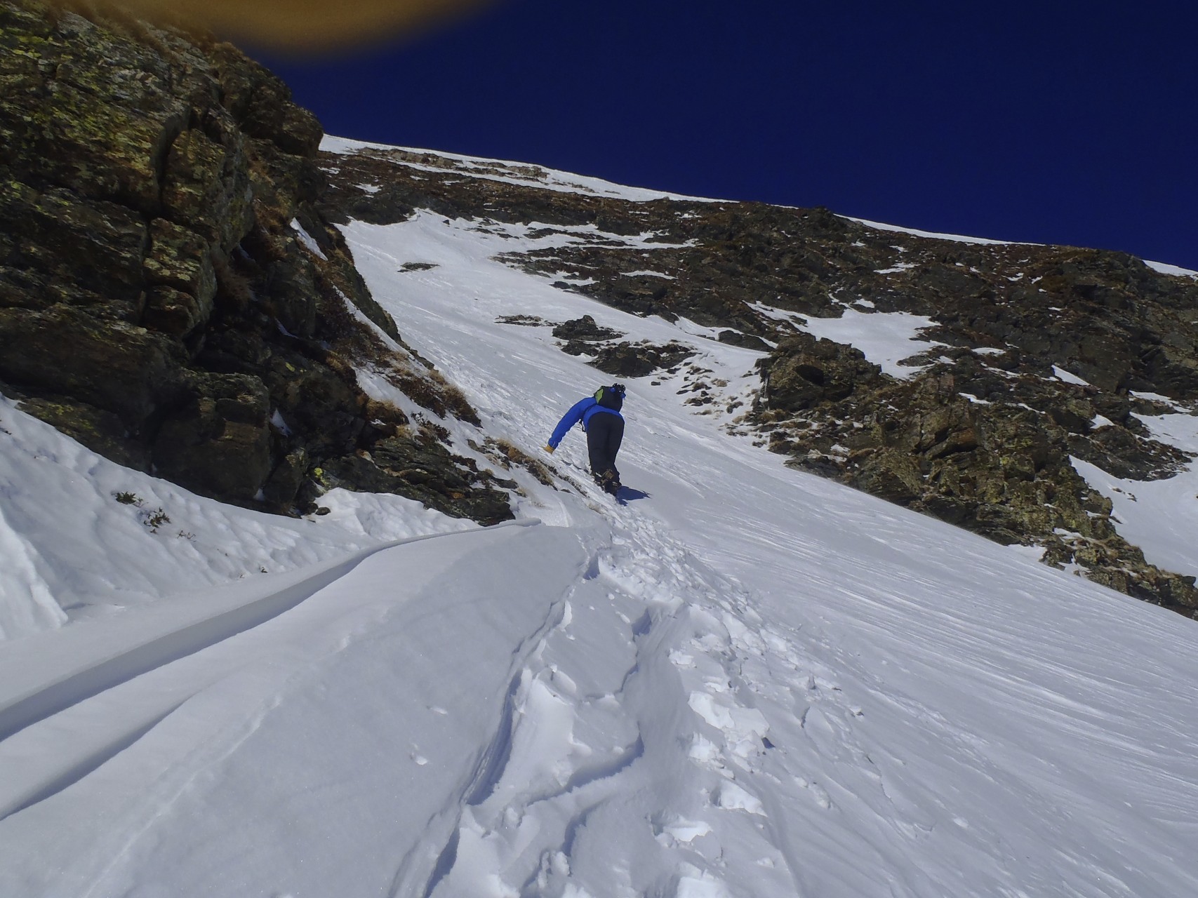 Como el Pico estaba bastante pelado de nieve se nos ocurrió en vez de subir directamente al collado, subir directo por una pequeña canal de 40-45º que si tenía nieve que hay a su derecha para probar algo mas de inclinación.