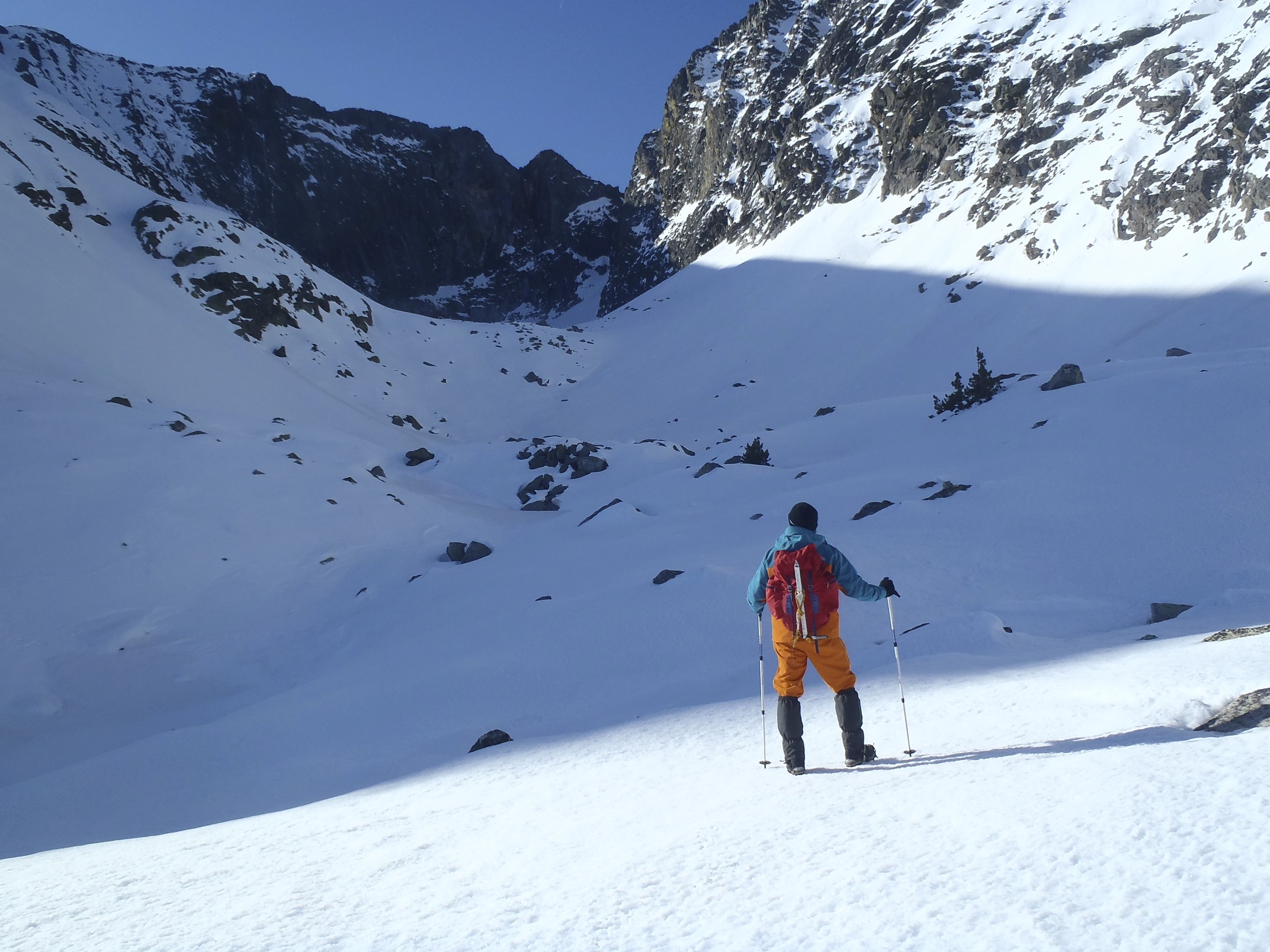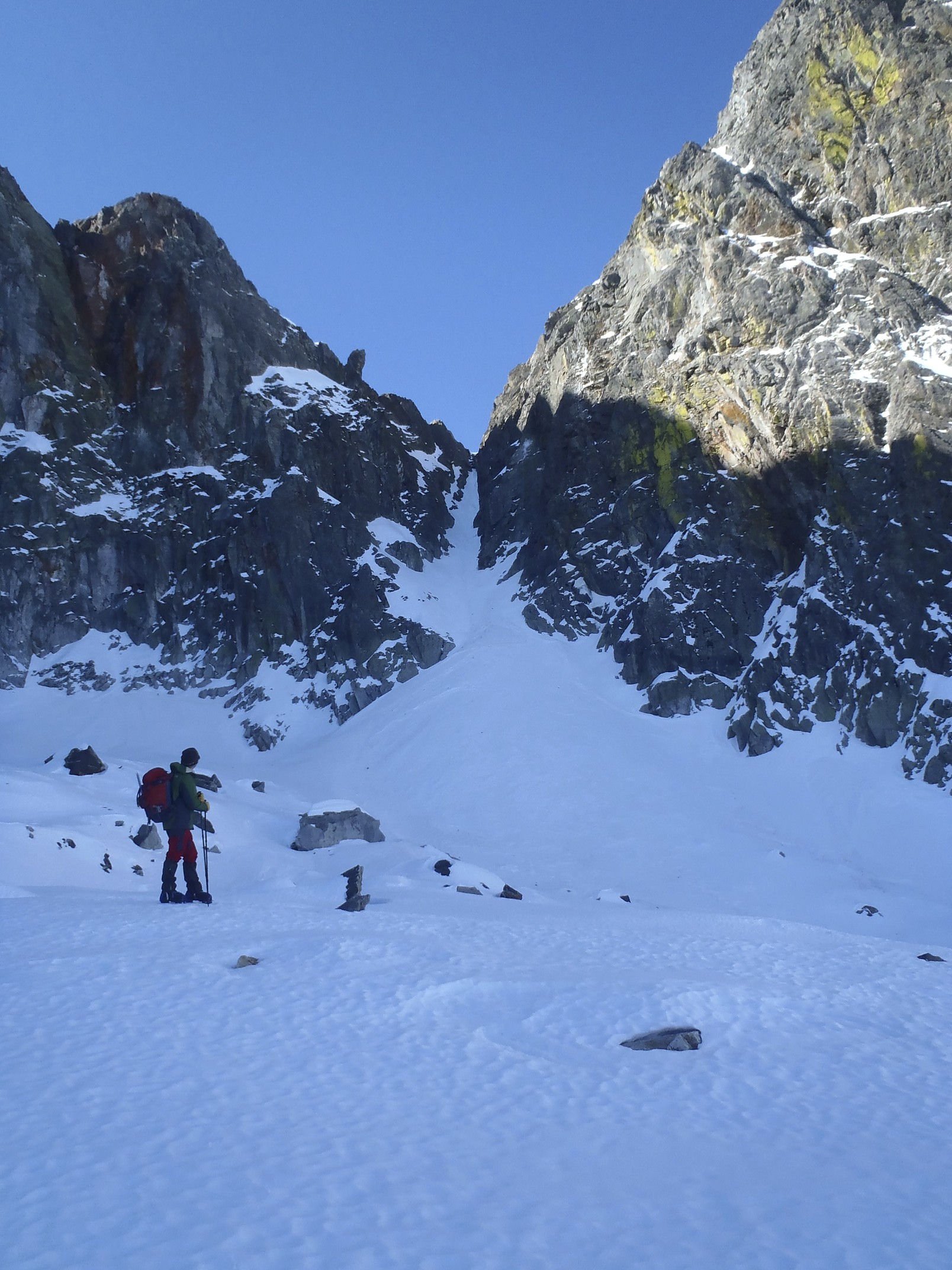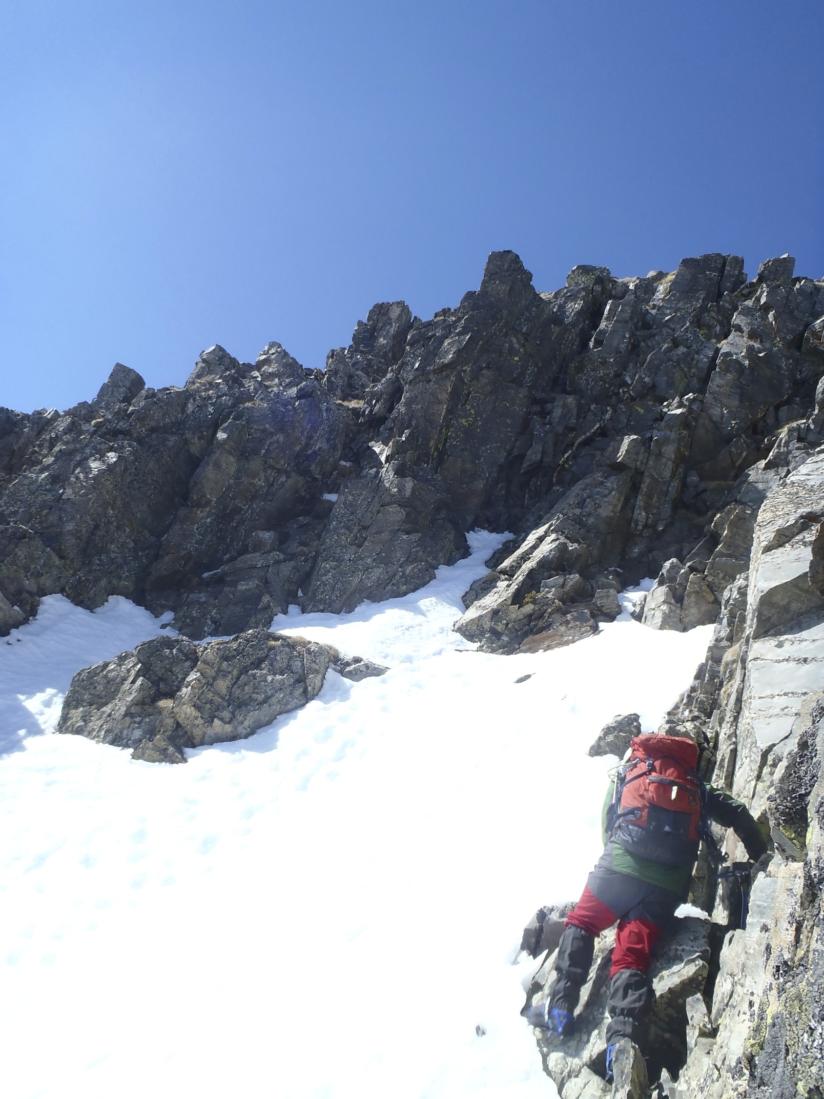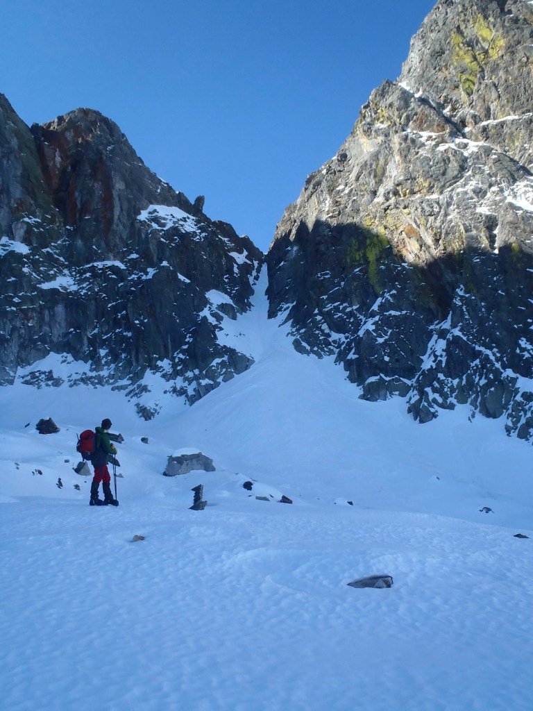 Enfrente las paredes verticales del Barbet, el dia soleado y hoy enfrentamos nuestra primera canal . Un cordino auxiliar de 30m , varias bagas, cintas , una par de enpotradores, casco, piolet, crampones y hacia arriba.