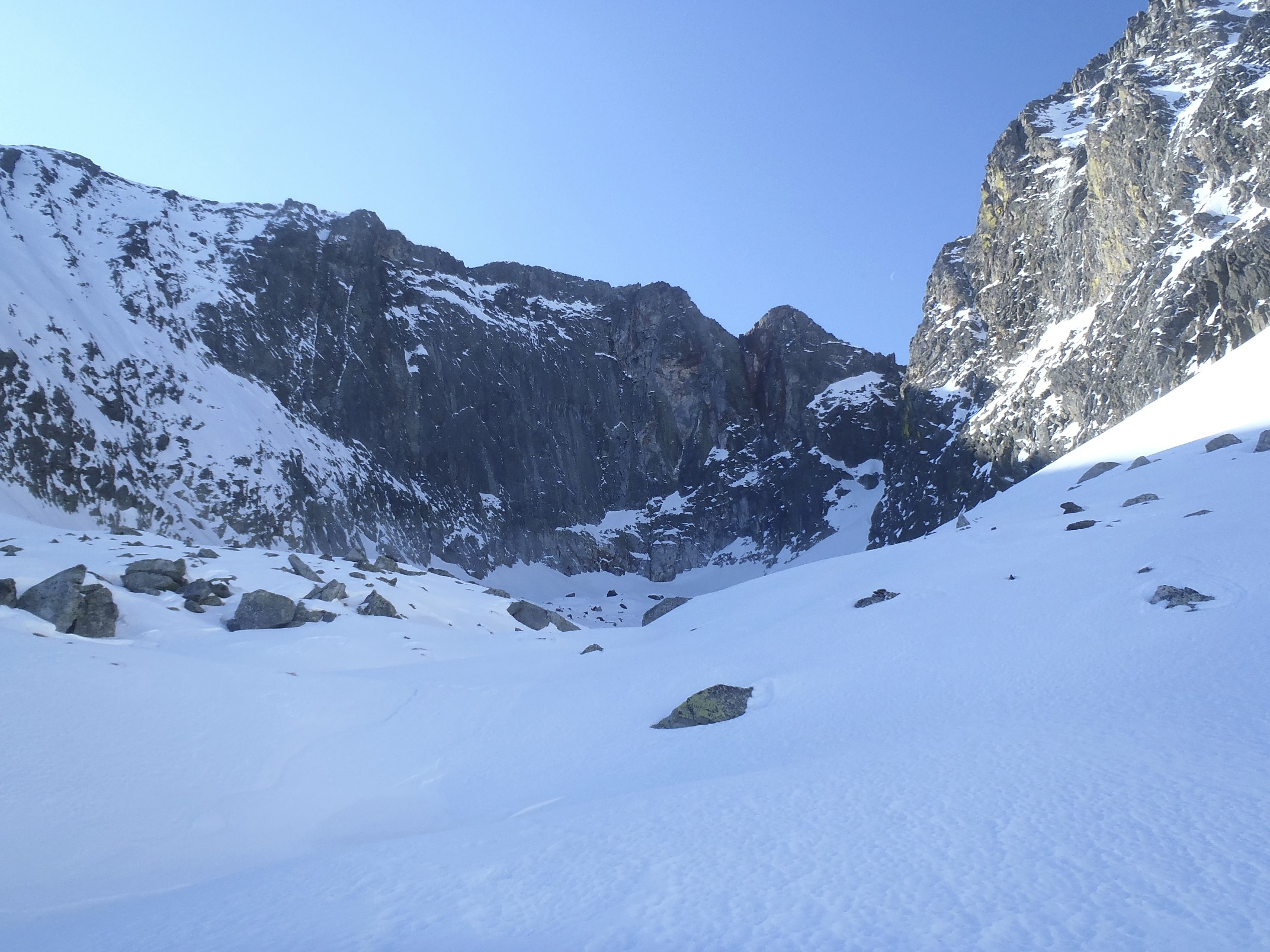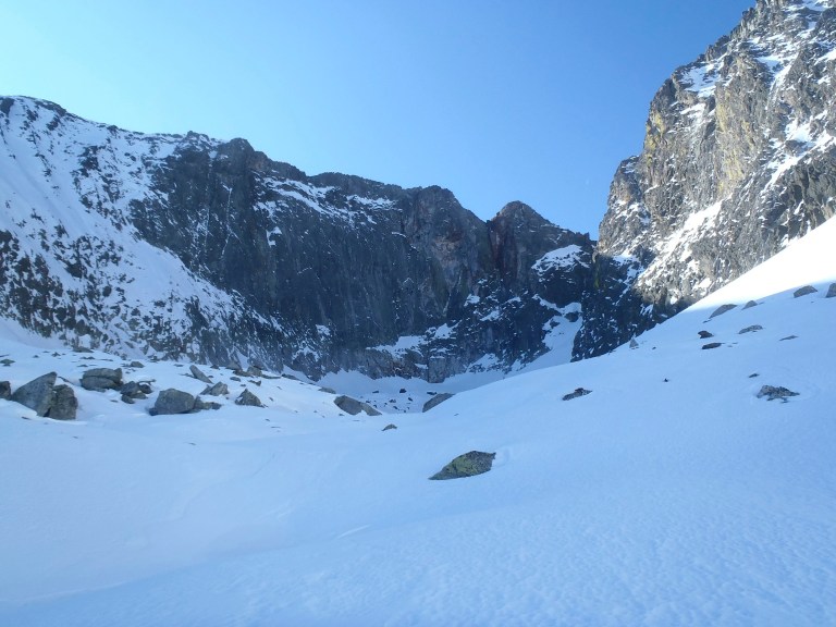 Según la guia se trata de un sencillo corredor de 200m con 30-35% al principio, para pasar después a 40% con algún pequeño resalte de roca de IIº si hay poca nieve.