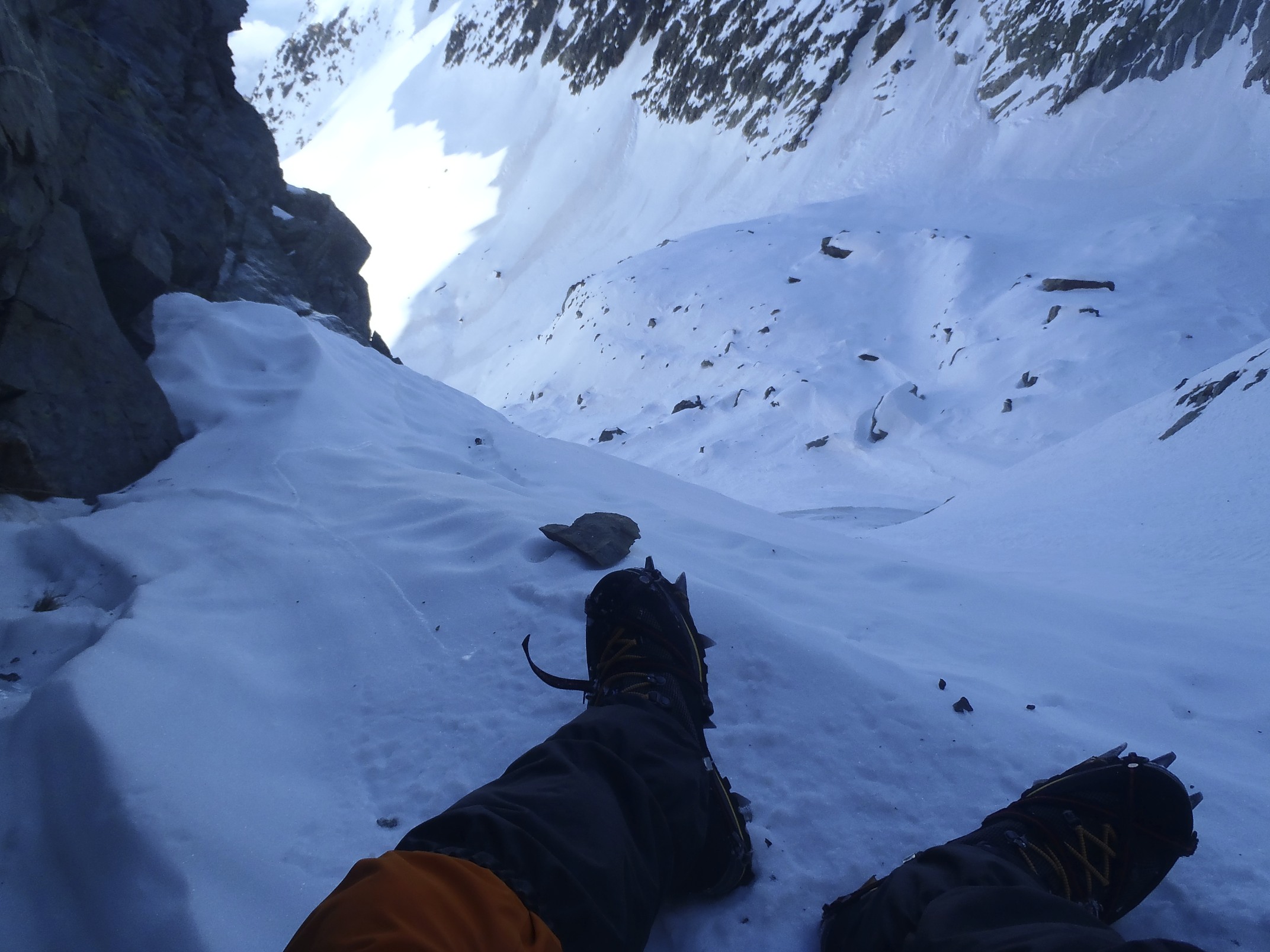 Veo en la rocas de la izquierda una posibilidad de seguro, pero conforme me acerco a las rocas el hielo se endurece mas, ademas el seguro no me sirve, vuelvo al centro de la canal. Para arriba, veo una zona que parece una acumulación de nieve clara que parece mas horizontal. Reunión.