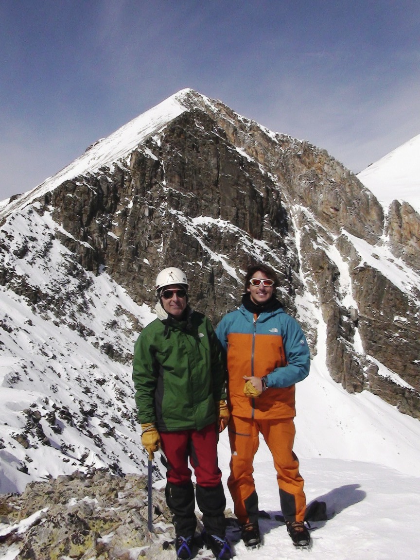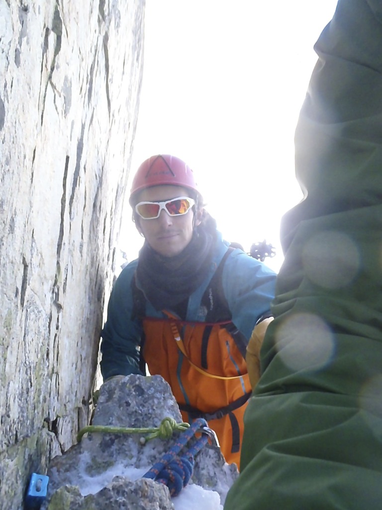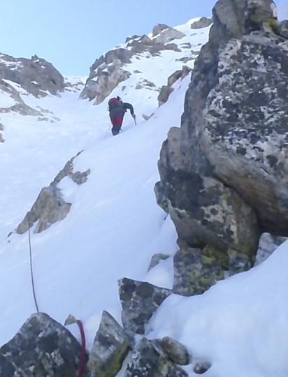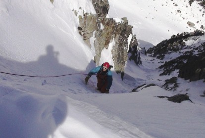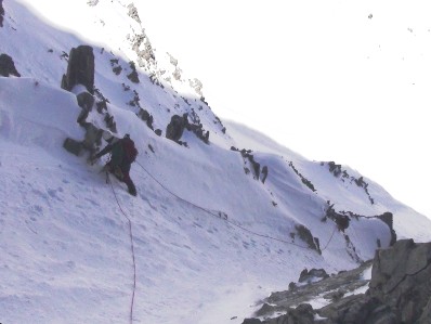 Llegamos al resalte, mixto con nieve blanda primero y después se ve un trozo de hielo sobre roca, dudas. Aunque sin arneses, nos encordamos y hago un intento, y mas arriba como estará? no lo veo.
