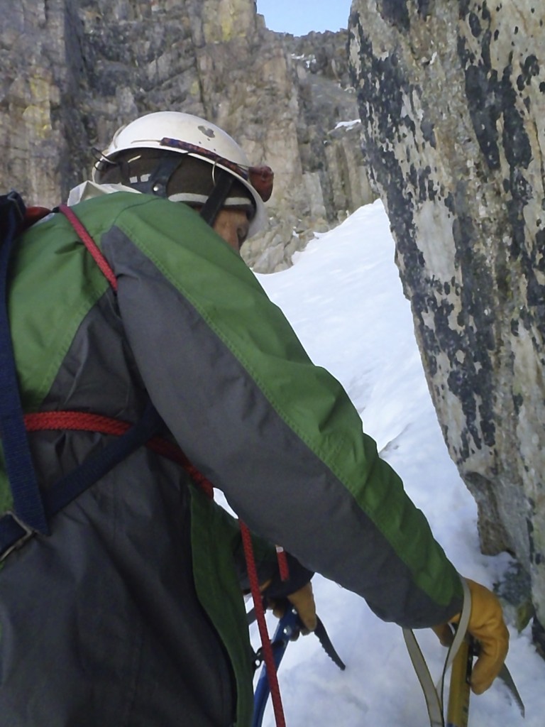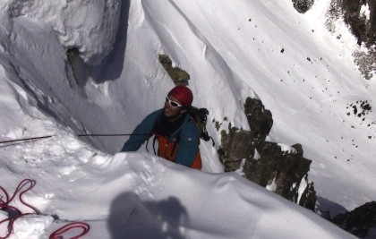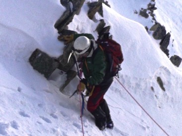 Gerard en precario esperando que pase el trozo mas derecho, que si, que no. No lo veo. Después de pensarlo un poco, para abajo. Tenía que pasar, algún día nos tocaría bajarnos. Es muy distinto subir por nieve dura que hacerlo por hielo. Falta de experiencia, técnica, costumbre. Destrepamos hasta la pala inferior al resalte.