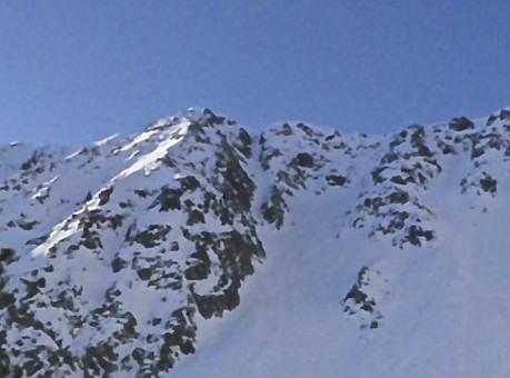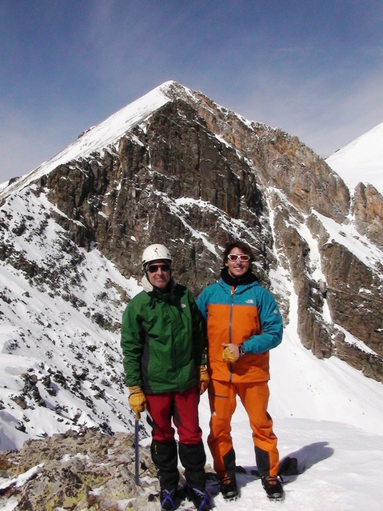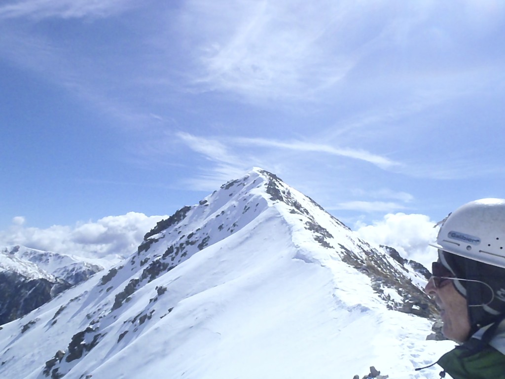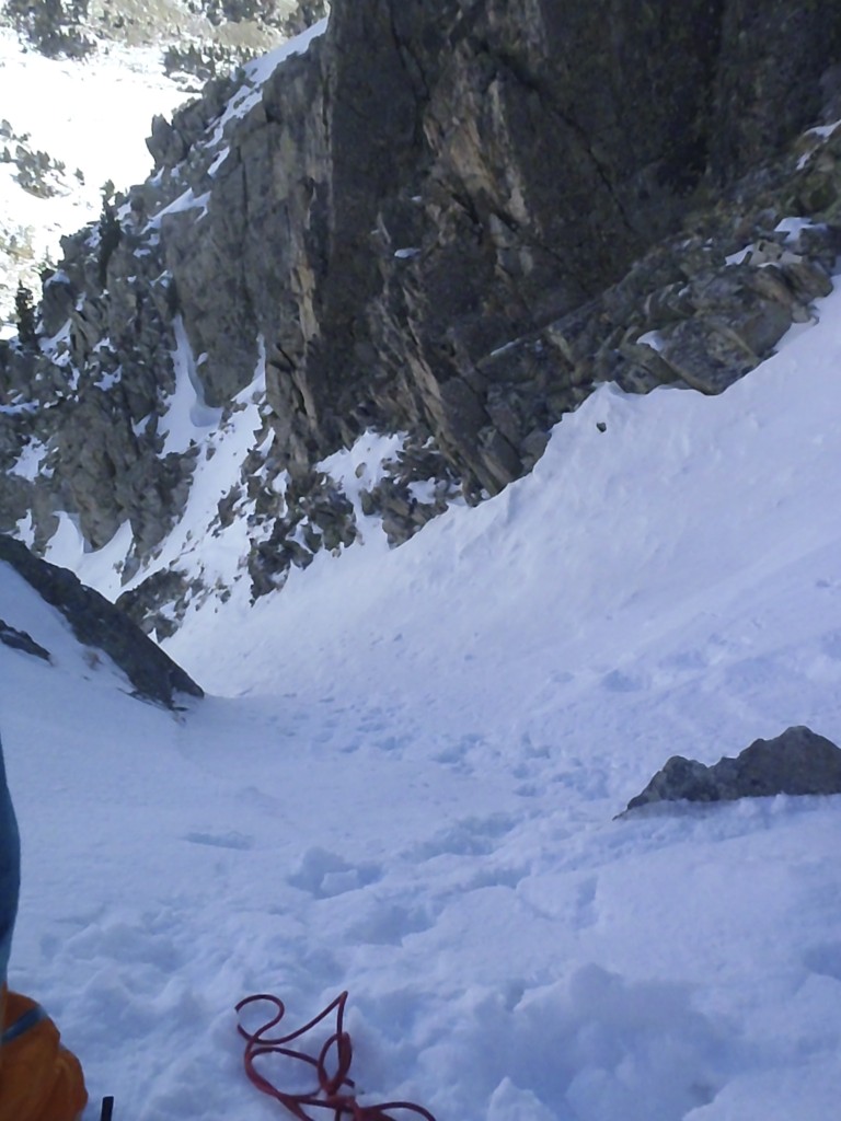 Disfrutando hasta arriba, el buen tiempo se mantiene. Una vez fuera del corredor charlando un buen rato de montaña, beber un poco, comer algo y para abajo por la canal de descenso, un poco mas a la derecha.
