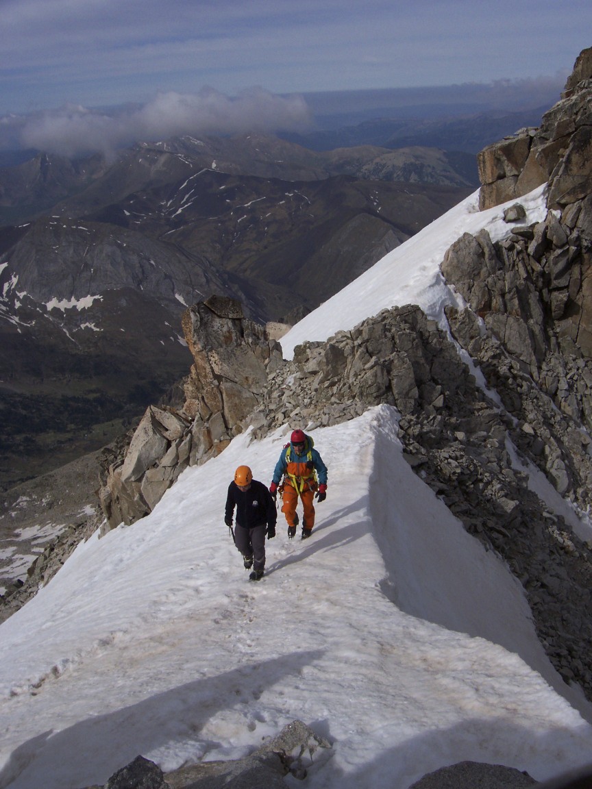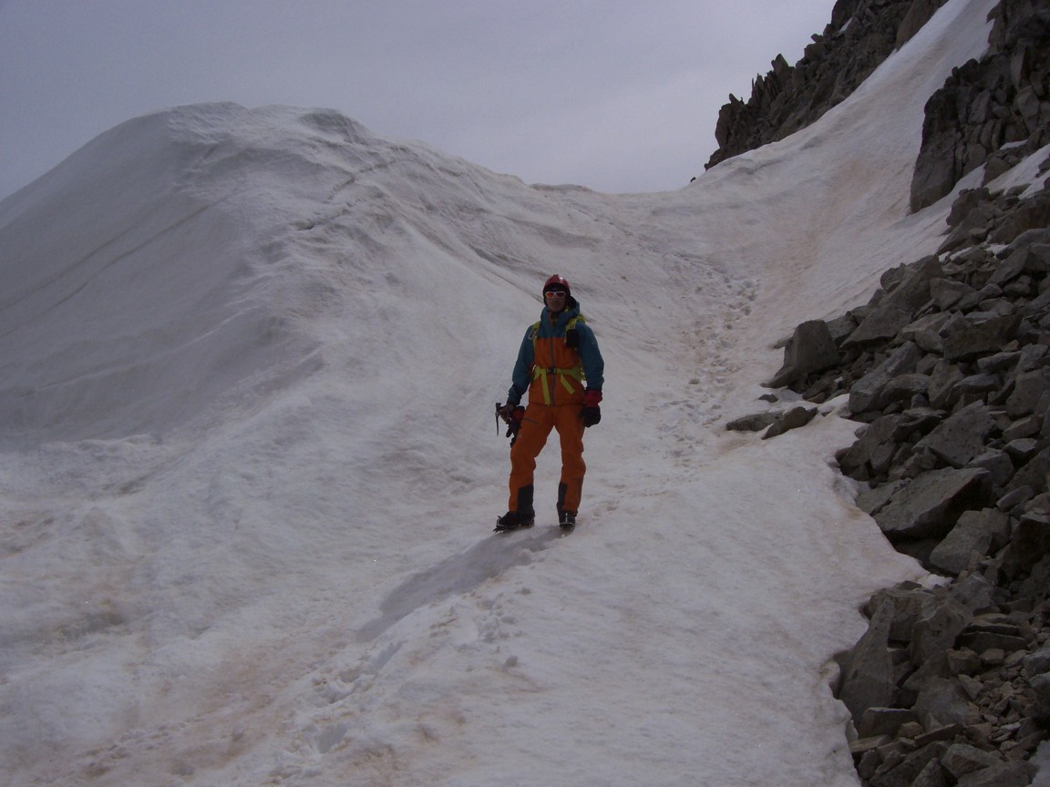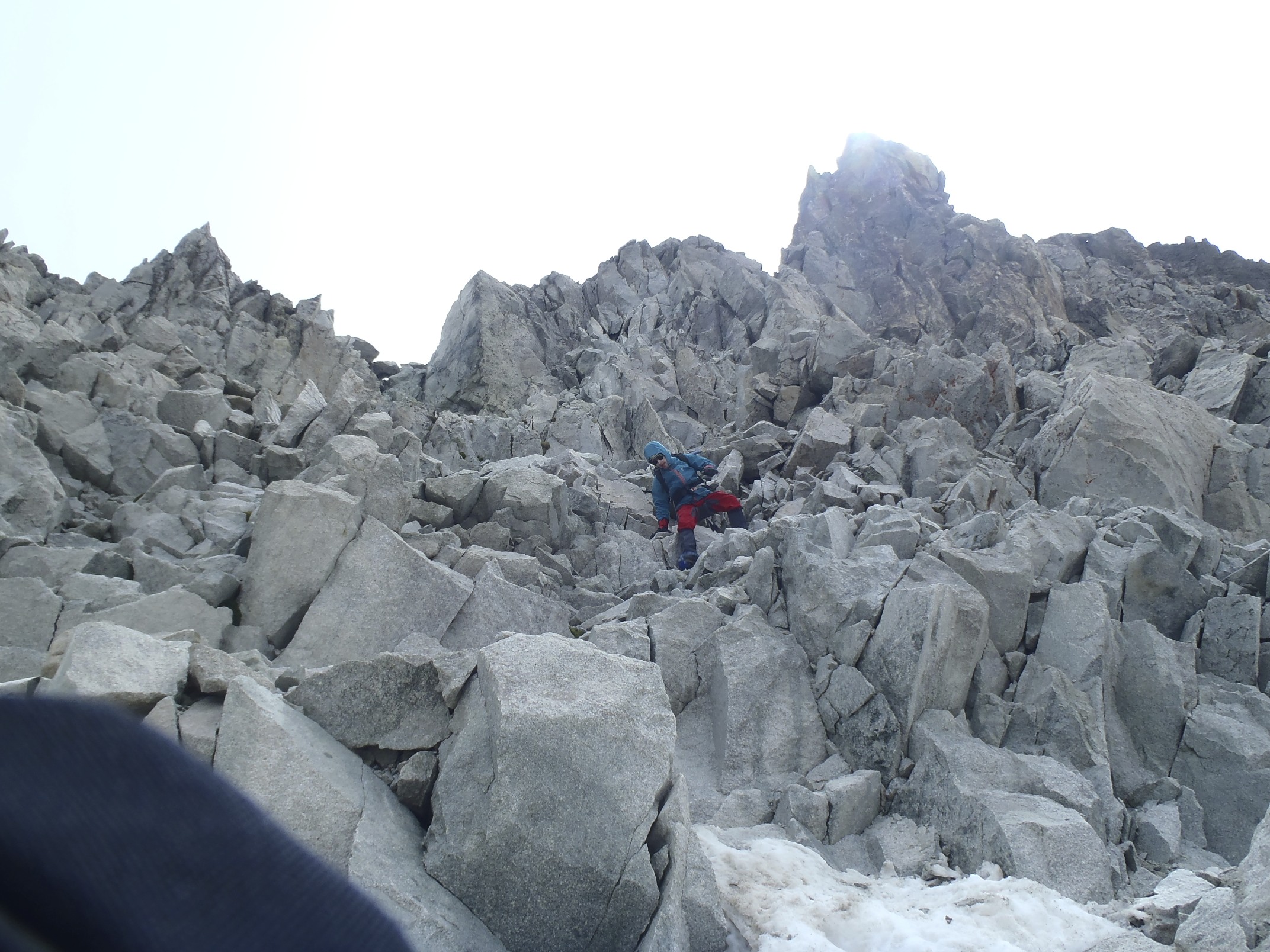 Cumbre del Aneto 3.404m, a partir de aqui, empezamos a bajar, pasando por el paso de mahoma. Impresionante, pero no por la dificultad, ya que con cuidado se pasa bien, sino con el follón de gente, que viniendo por la normal desde el refugio de la Renclusa estaban haciendo un tapón para pasar. Al otro lado de puente había como 50 personas para pasar a la cumbre, que junto con los que queriamos bajar…