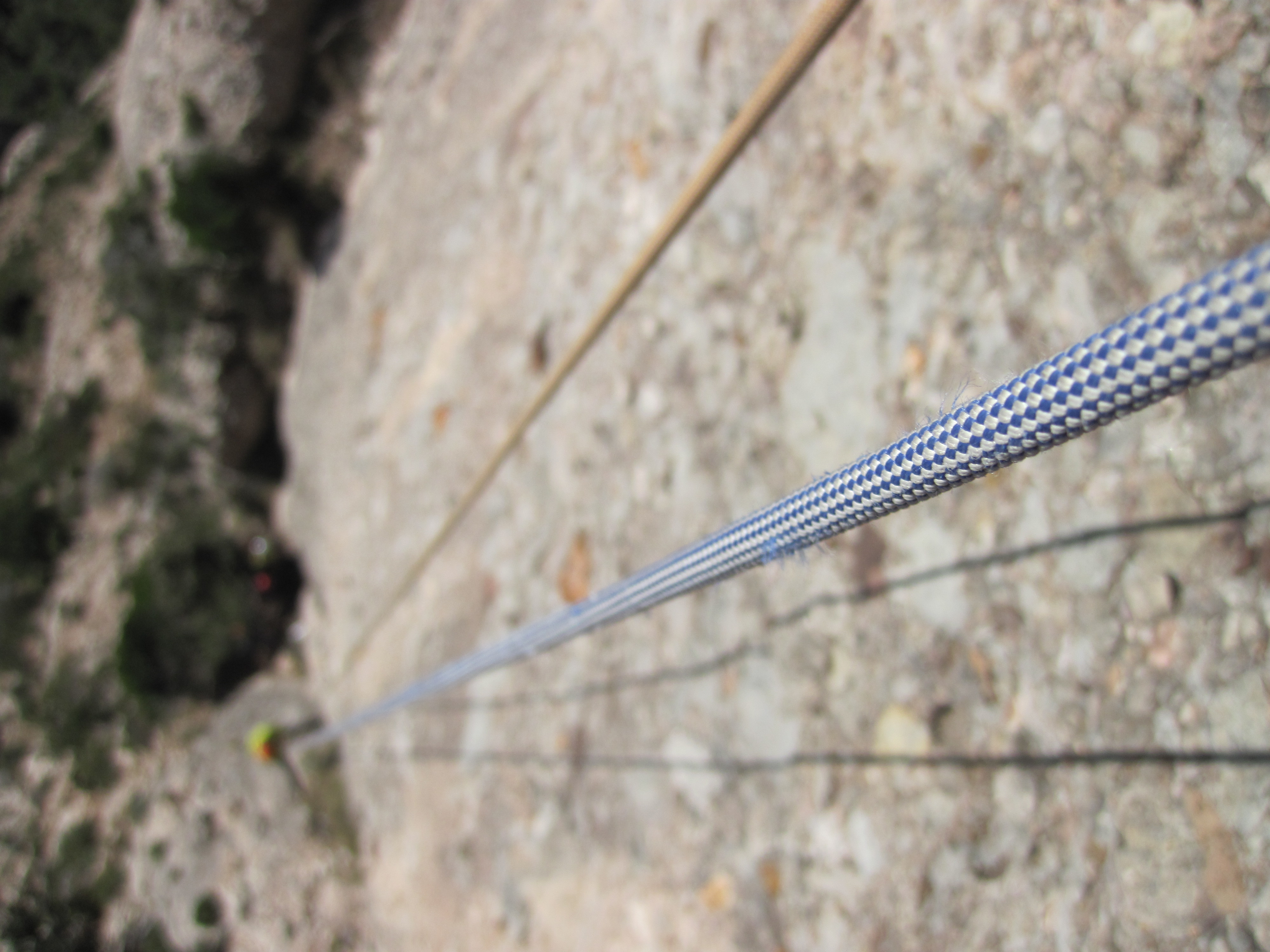 La dificulad V inferior, parabolts y reuniones atómicas.  Una gozada de roca, hormigón «made en Montserrat» con piedras de todos los tamaños solidamente empotrados. Sin dudas, solidez asegurada.