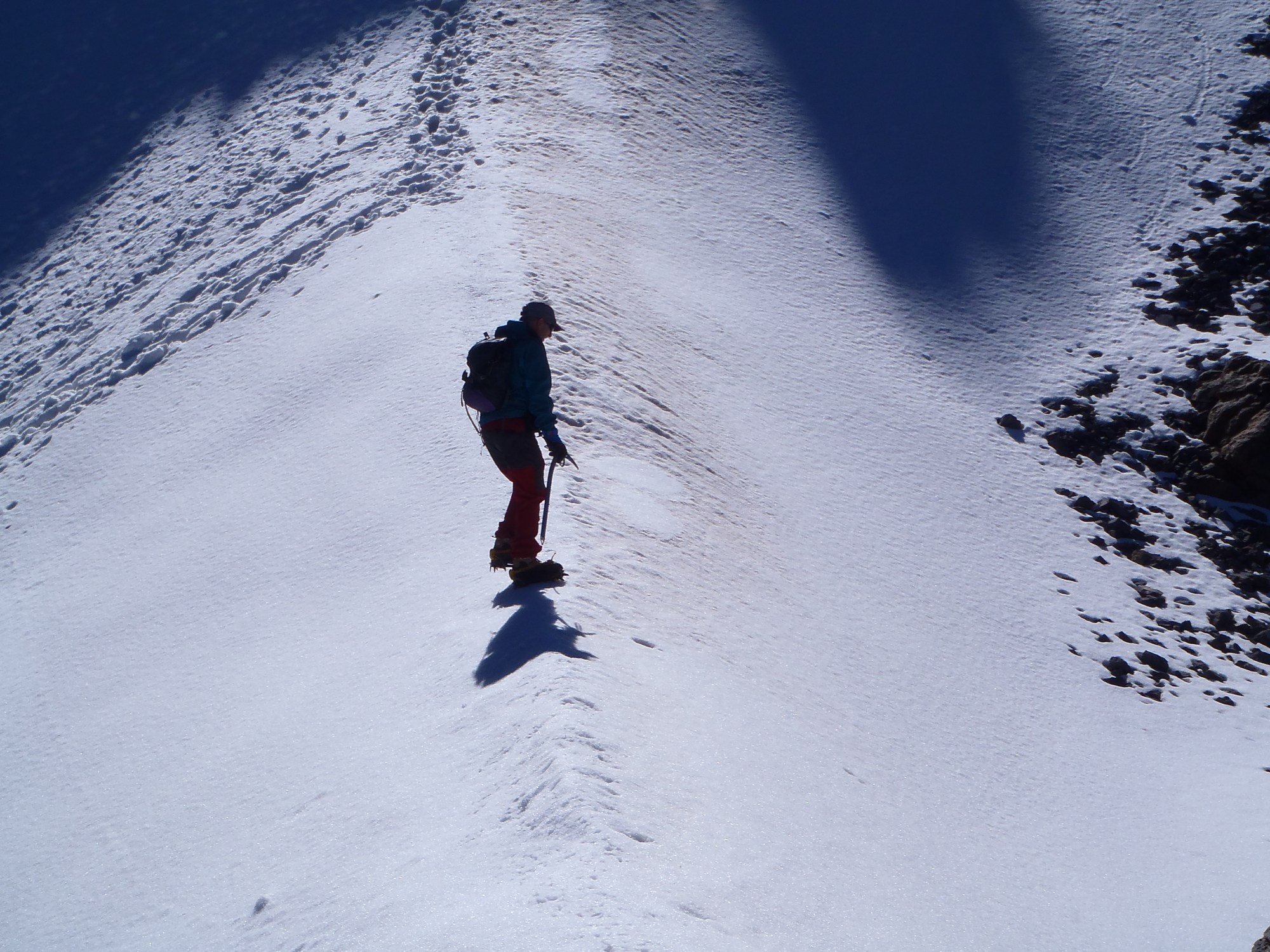 En la arista iluminada por el sol al pie de los contrafuertes de la cumbre fue donde me quedé, quedaba poquito!Aqui se acababa mi ascensión, muy cansado, y viendo el lento y «cuidadoso» andar del gente (no es un sitio para andar torpe) y el esfuerzo que me iban a requerir esos 200 m. que faltaban, pensé que ya había hecho suficiente.