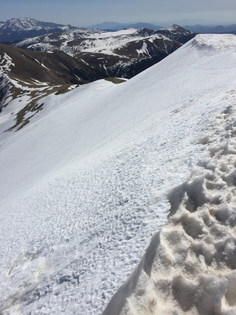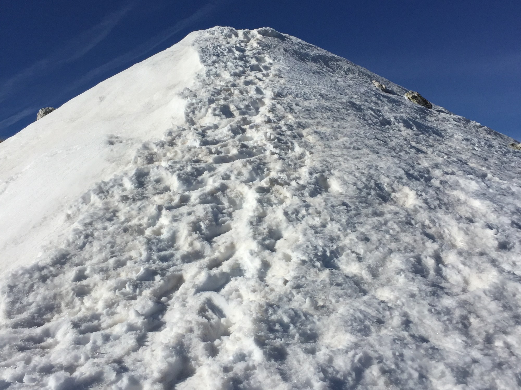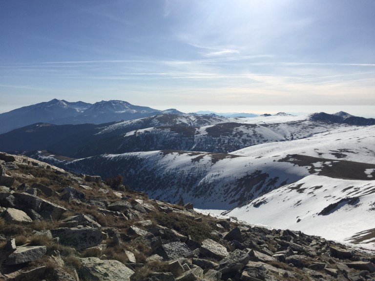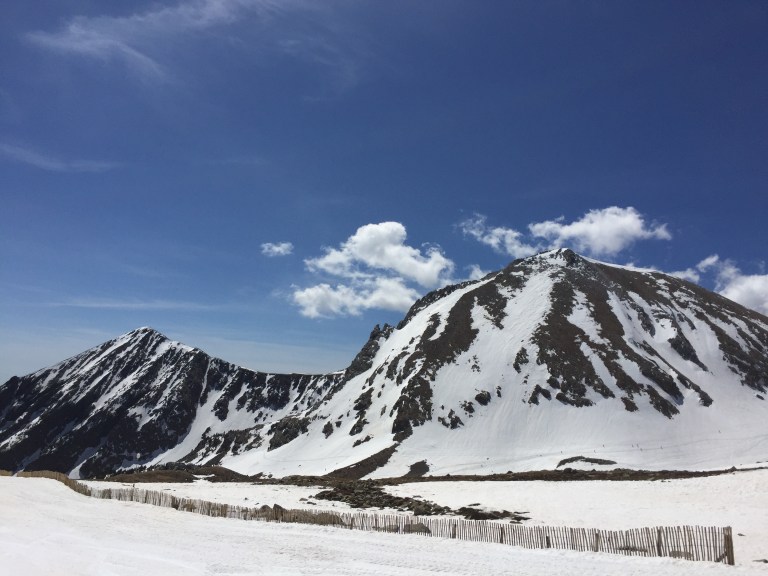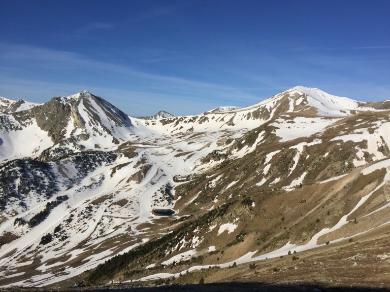 Disfrutar un poco de la cumbre, unas fotos y empiezo el descenso hacia el coll de la Marrana en la ruta normal. La consistencia de la nieve ya no es igual en la pala del Bastiments, trato de enlazar los tramos de nieve y finalmente decido bajar a las pistas directamente por una pendiente antes de llegar al coll.