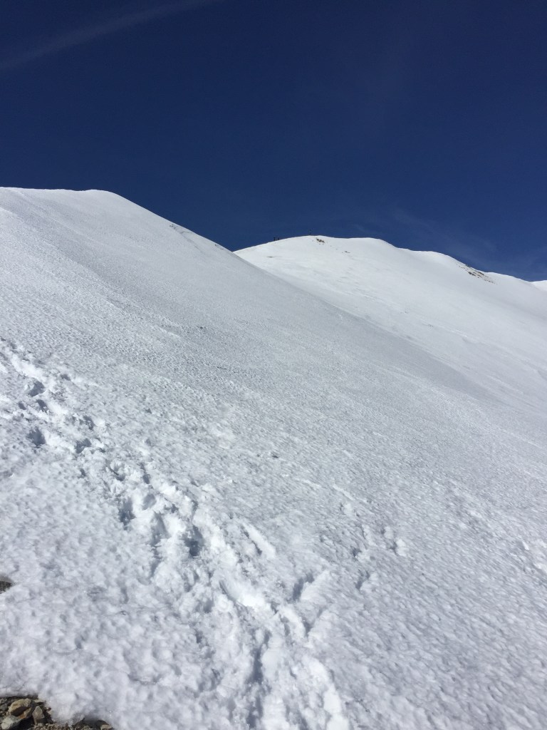 Subiendo por el fondo de un pequeño barranco salgo al sol en el collado y tiro hacia la cumbre del Pic de la Dona , el tiempo espléndido, y no hay nadie, solo he visto a una persona que me precede a unos cientos de metros. Las botas, muy bién, después de un par de paradas para apretarlas un poco. Comparadas con mis anteriores botas de alta montaña, la primera sensación ha sido de ligereza, y la sujección del pie muy eficaz, el conjunto bota-crampón muerde la nieve endurecida por la helada nocturna y ya estoy en la cumbre.