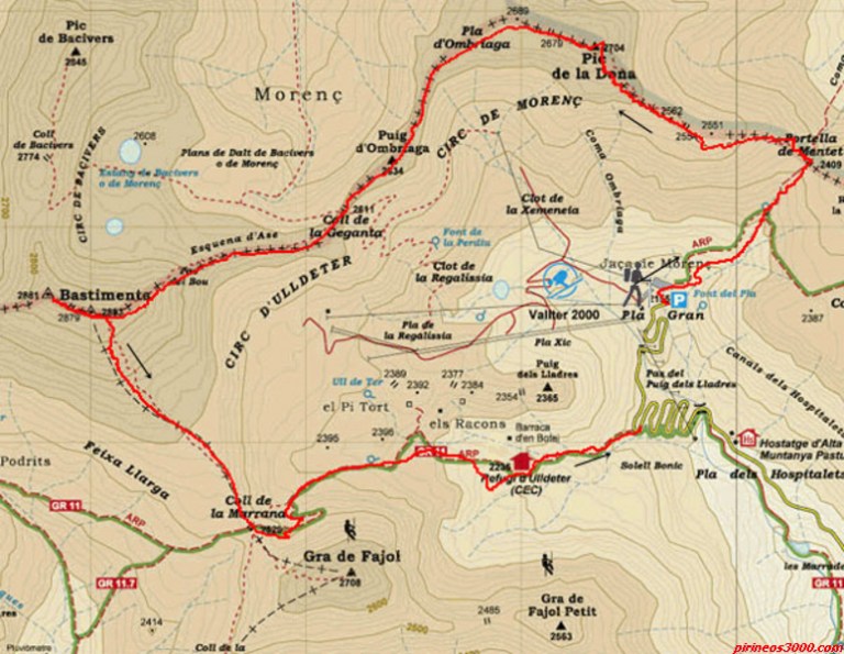 Debajo la ruta aproximada que he encontrado en la red, excepto que yo, a mitad de recorrido entre el Bastiments y la Marrana , tiré directo hacia las pistas y hacia el parking superior de Vallter ( P azul en el mapa ) donde tenía la furgo.