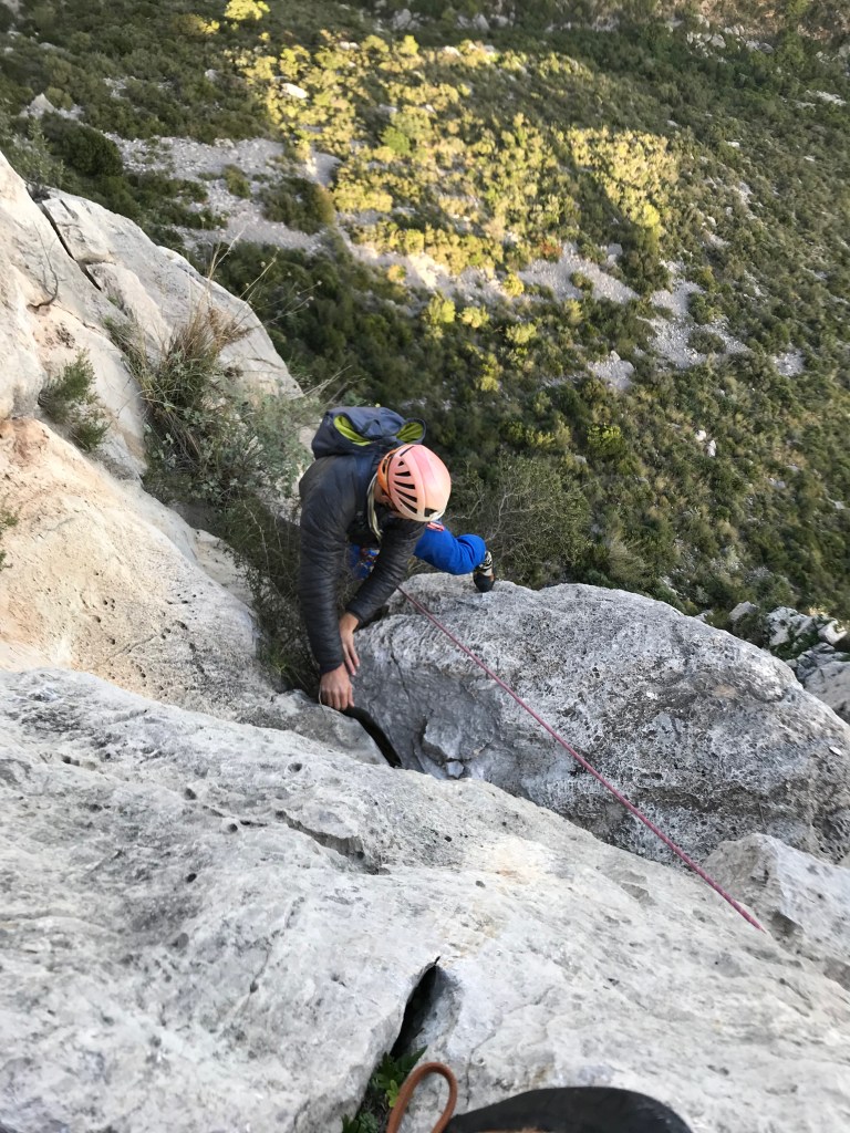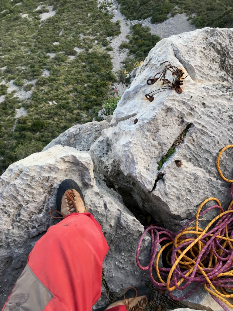 En el 2º largo me las apañe con estribos y cogiéndome a todo, pero en el 3º se me acabaron los recursos y se impuso la realidad. Cansado y sin la posibilidad de subirme a los pedales porque no había bolts a mano, estuve un buen rato, largo rato mas bién, intentando pasar, … y nada. Los consejos de Gerard s¡desde abajo, bienintencionados, no surtieron efecto. Sube el pie, cojete allí, mano arriba, etc, y no hubo manera.