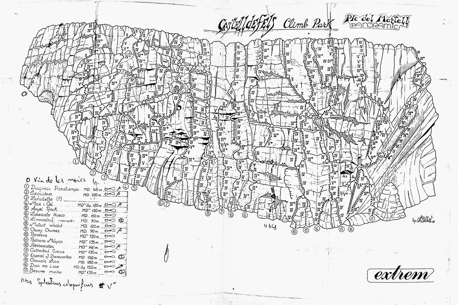 Esta estupenda reseña fue publicada por Armand Ballart, mis respetos, en la revista Extrem en los años 80, o quizás en los 90?, y ya estaba así…hoy no se lo que debe haber…no quedará ni un palmo de roca sin vias.