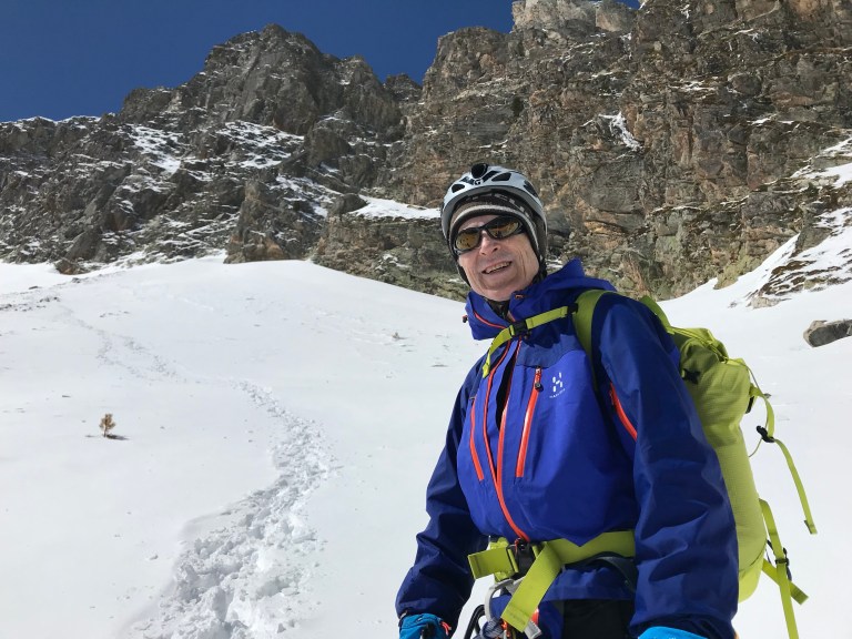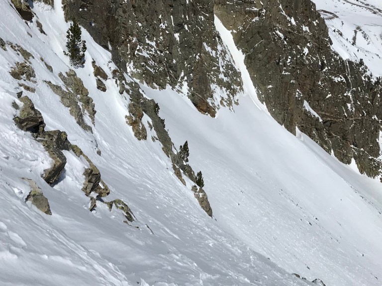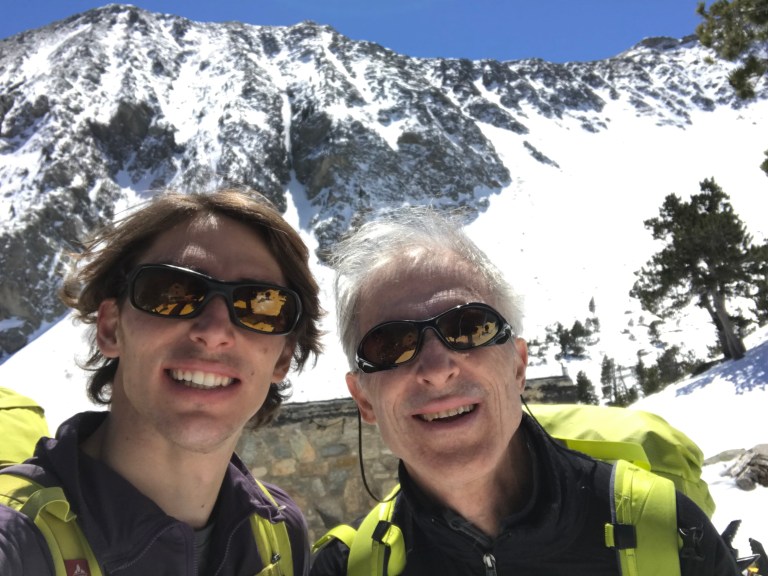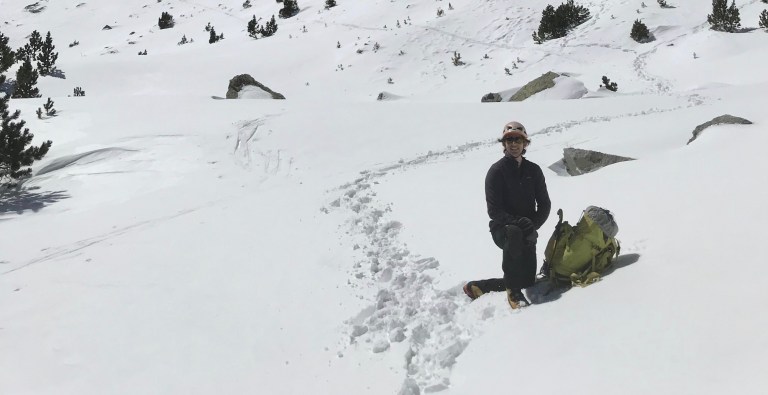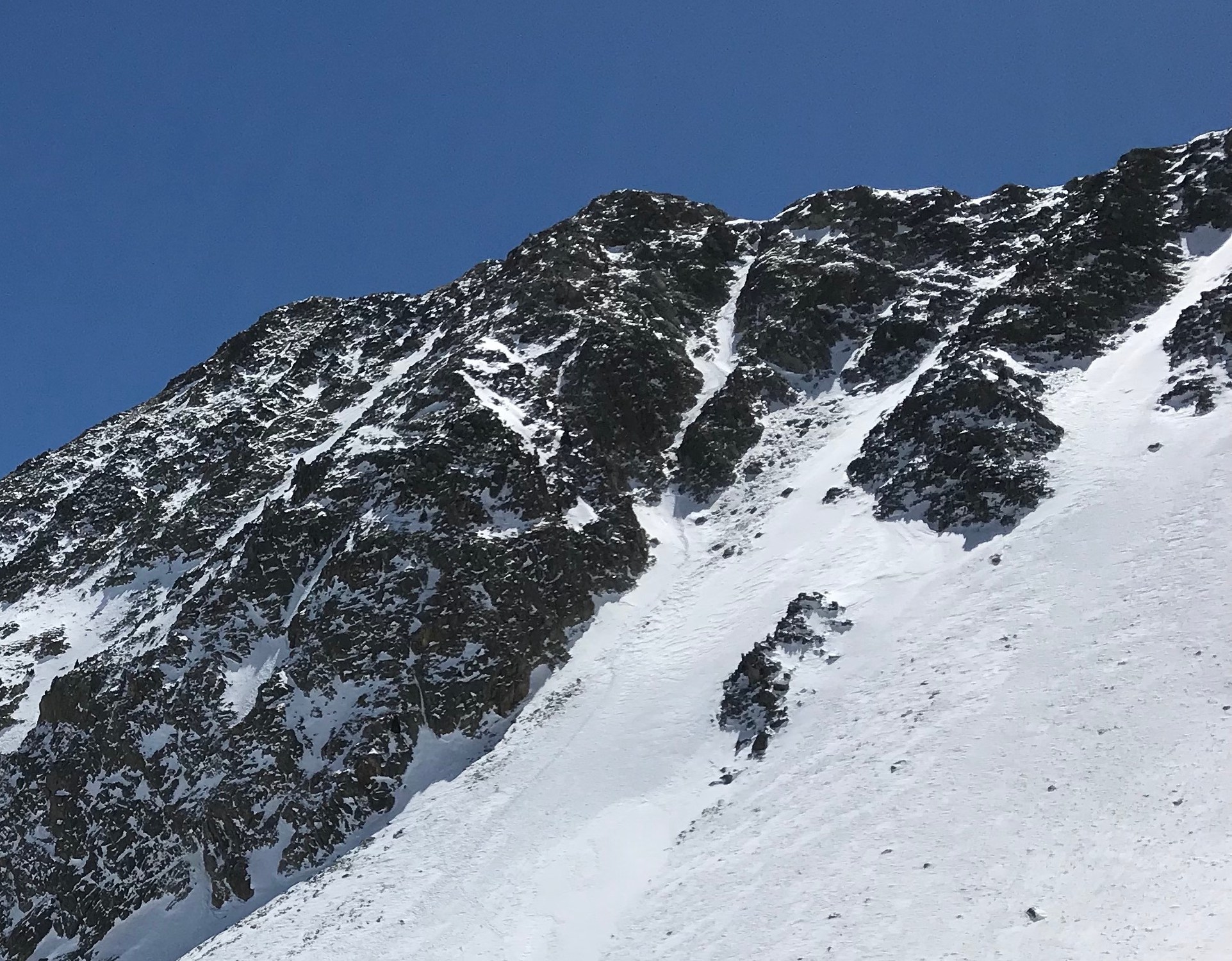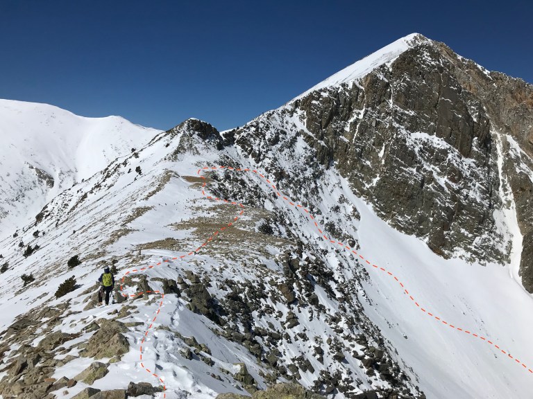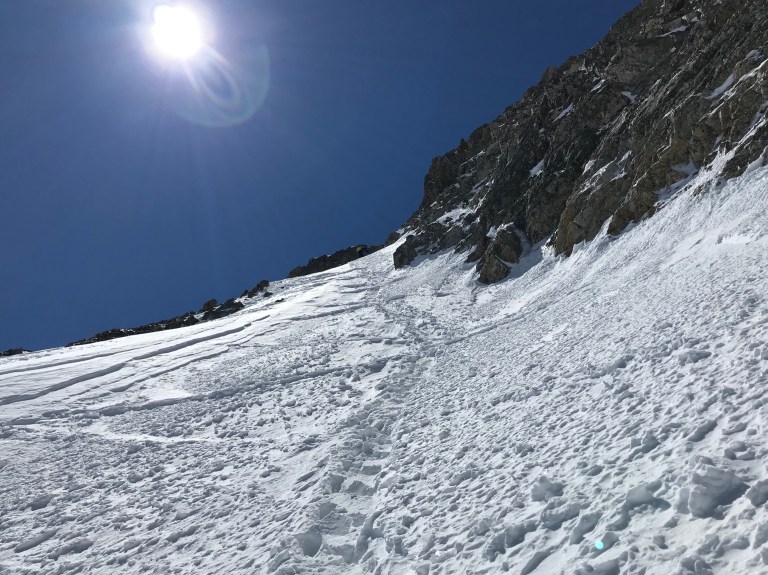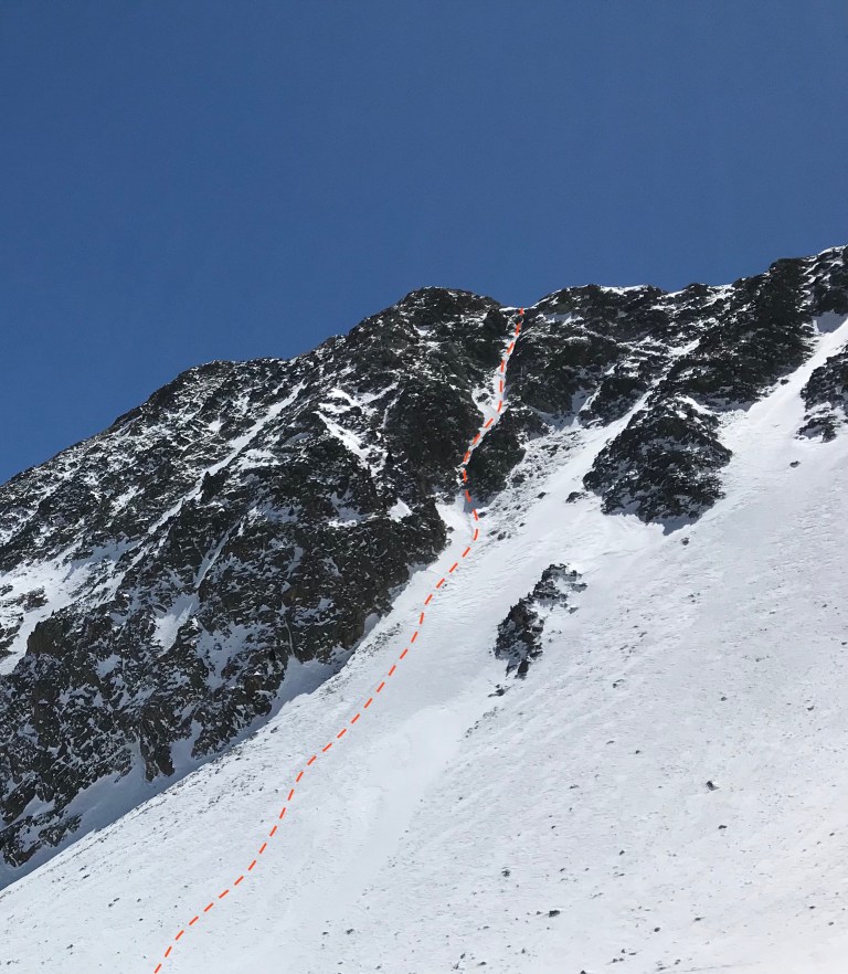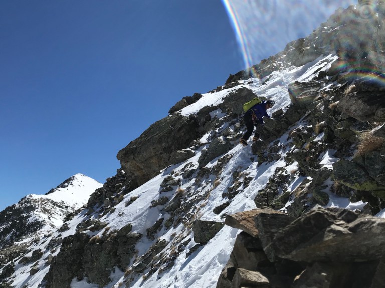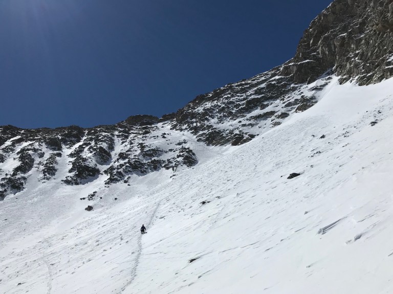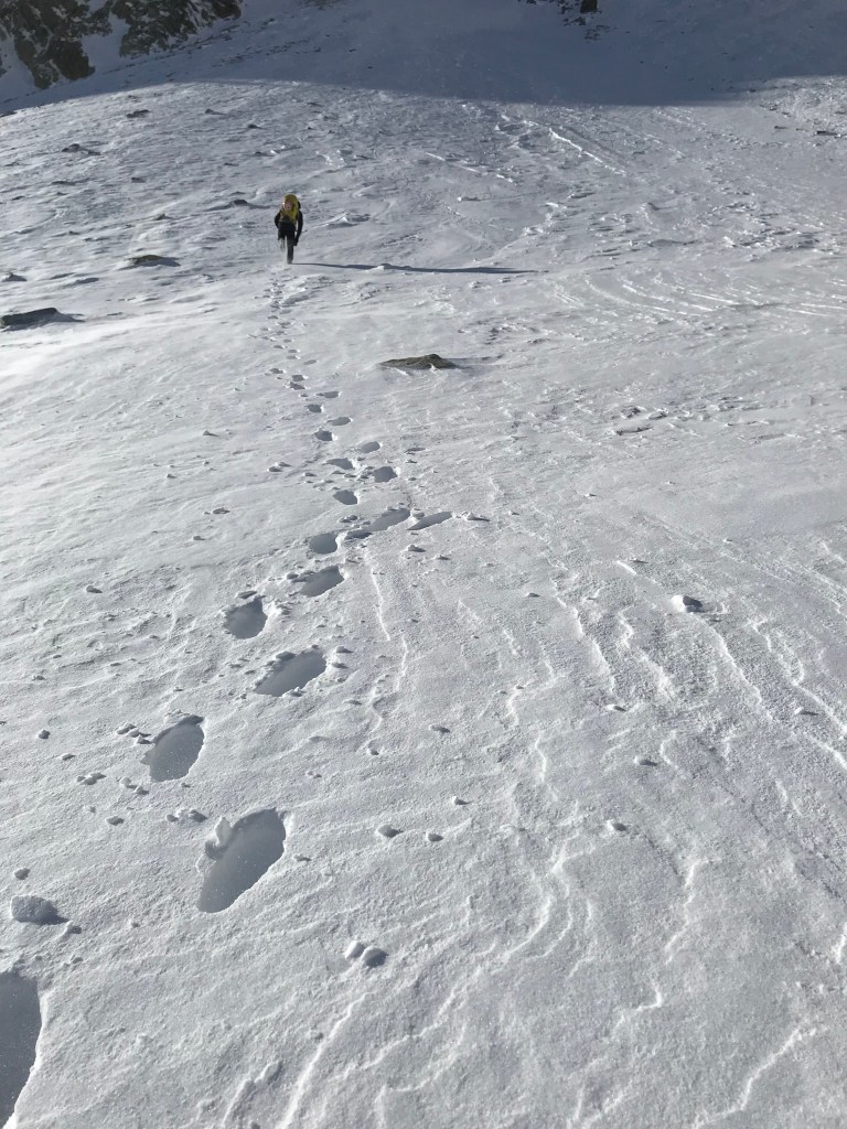 Ha sido fantástico, la montaña y nosotros dos, tratando de adaptarnos a sus condiciones. Ya estamos arriba, en la arista, al sol, recuperando un poco de temperatura. Pero la actividad no acaba hasta que no estás abajo, y esta vez tenemos «diversión» asegurada, ya que por falta de nieve la bajada habitual no tiene buena pinta. Entonces vemos, más al este, las únicas trazas de lo que parece la mejor bajada posible. Y por ahí fuimos.