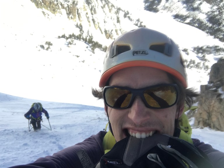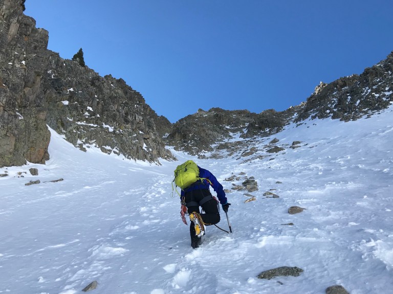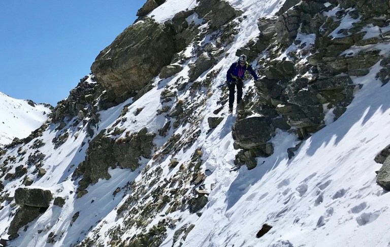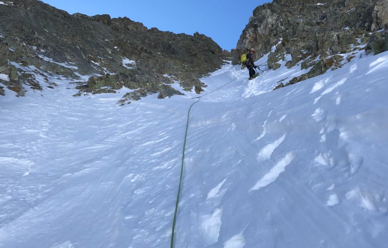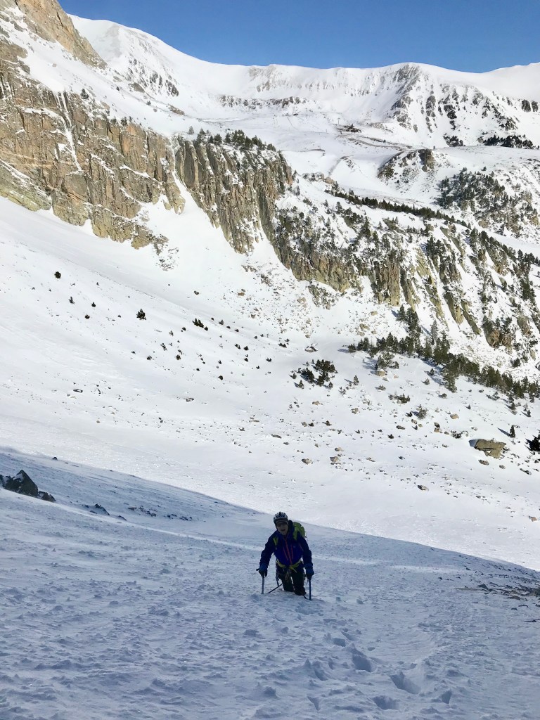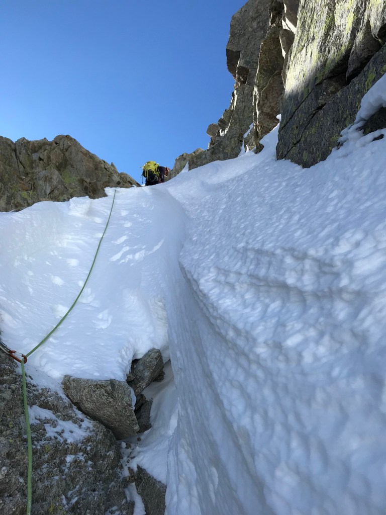 Una vez en el corredor encontramos un resalte sin nieve, sacamos la cuerda y Gerard fue colocando algunos seguros. Había trozos donde el piolet se hundía hasta la cruz, en otros, la capa inferior de nieve dura permitía progresar mejor. Lo peor, las rocas tapadas y los crampones haciendo el clásico sonido de chirriar sobre la base rocosa.