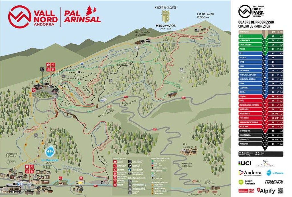 Para el que no lo conozca, básicamente de lo que se trata es de continuar la explotación de la montaña del invierno, con las pistas de ski, con las bicis, y para ello han trazado una serie de rutas de bajada por las mismas pistas y los bosques de la estación de diversas dificultades, desde iniciación hasta dificultad extrema.