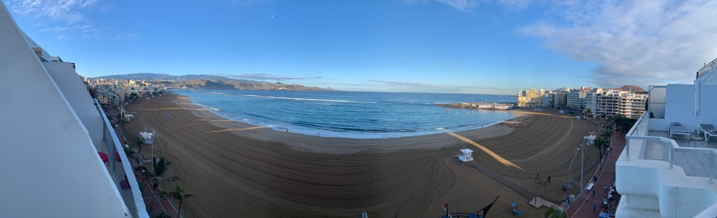 Panorámica de la playa de las Canteras temprano todavía, en sombra. Desde la Puntilla , a la derecha, hasta la zona surf, La Cicer, a la izquierda, recorrimos casi todos los días los 6km ida y vuelta. Primer baño canario del año!Un par de días de calima también tuvimosUn poco de buggy ( surf con tabla corta de espuma ) para recordar la fuerza de las olasLa Caleta, Las Palmas, camino del ConfitalLas puestas de sol en la Canteras, cada día diferentes.Barranco de TasarticoLa agreste costa de TasarticoBarranco de Fataga.Plantación de Aloe.Barranco de FatagaLa Aldea de San NicolásEl Valle de Agaete.Almendros en Flor.Ayacata , montañas del centro de la islaEscalando un poco , con Manolo y JuanAyacata, sector de escalada clásica «La Librería»Cerca del punto más alto , mal tiempo.
