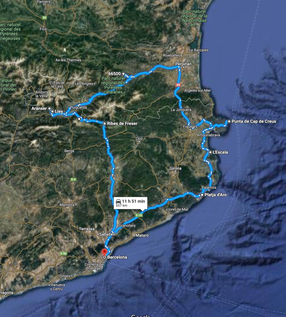 Barcelona-Ripoll-Ribes de Freser-La Molina-Puigcerda-Martinet-Lles de Cerdanya- Aranser-Arseguell-Prades-Perpiñan-Figueras-Cadaques-Port-Lligat-Cap de Creus-Barcelona.
