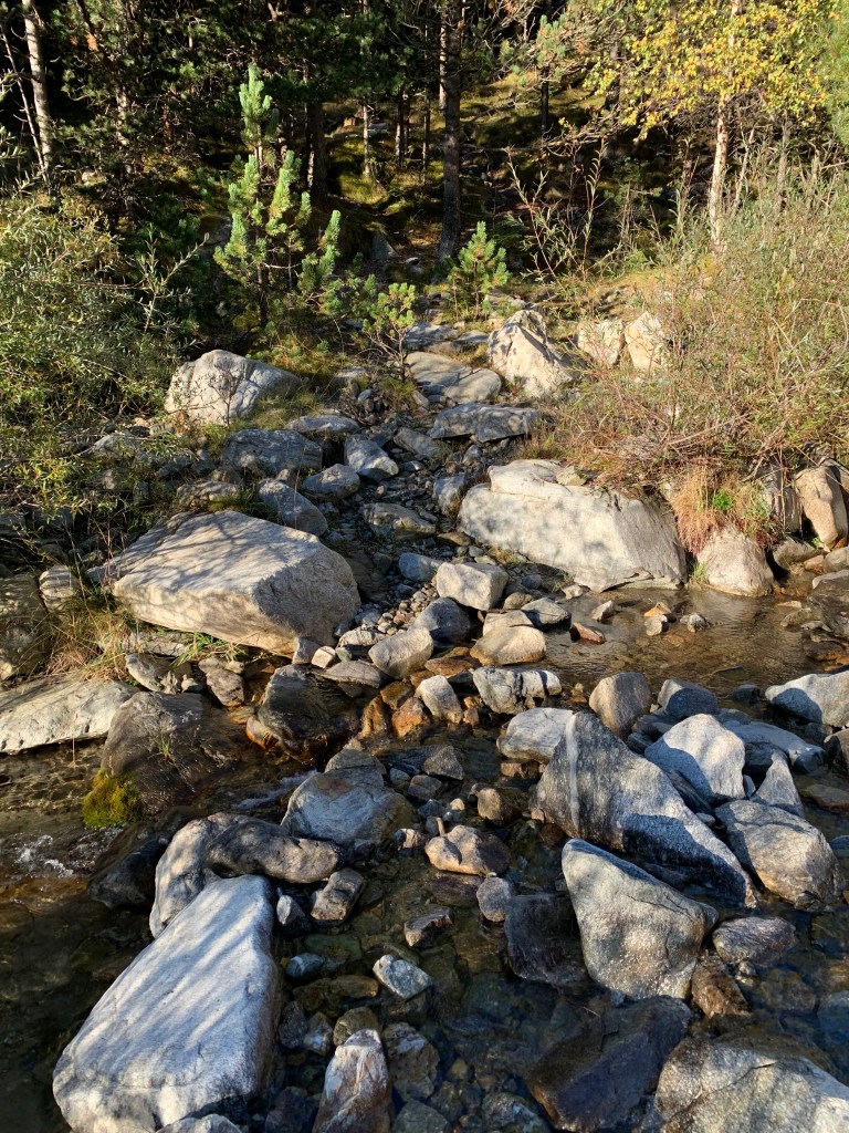 Es martes, salgo solo desde el parking, siguiendo aquí y allá los hitos que sirven de referencia. Primer punto de atención: cruzar el torrente en el sitio correcto, no como la vez anterior que me confundí y seguí demasiado tiempo por la izquierda perdiendo el tiempo en unas incómodas pedreras.