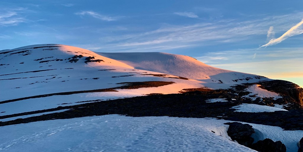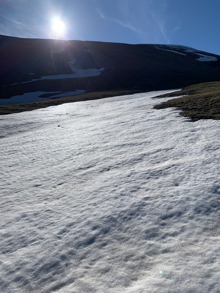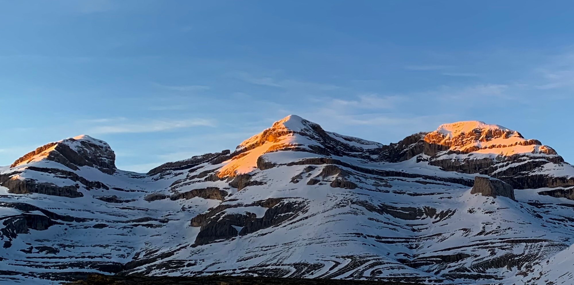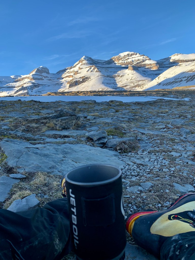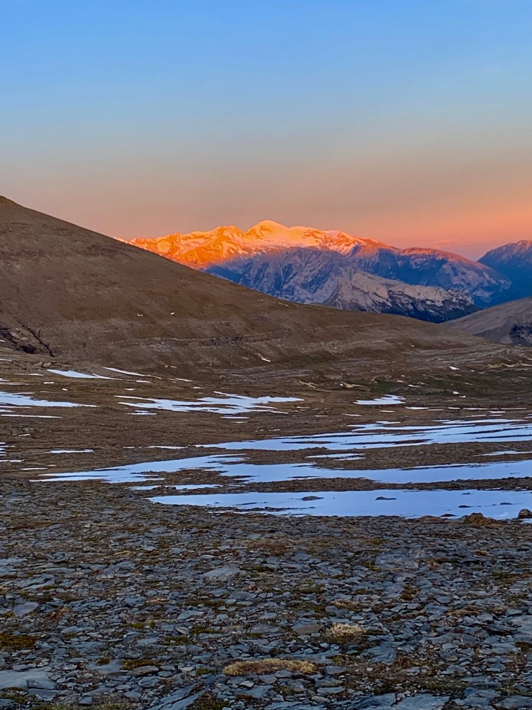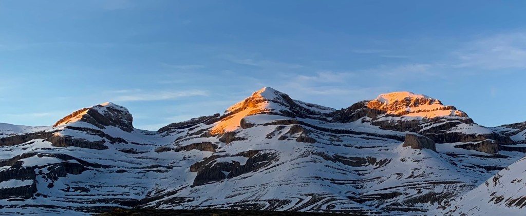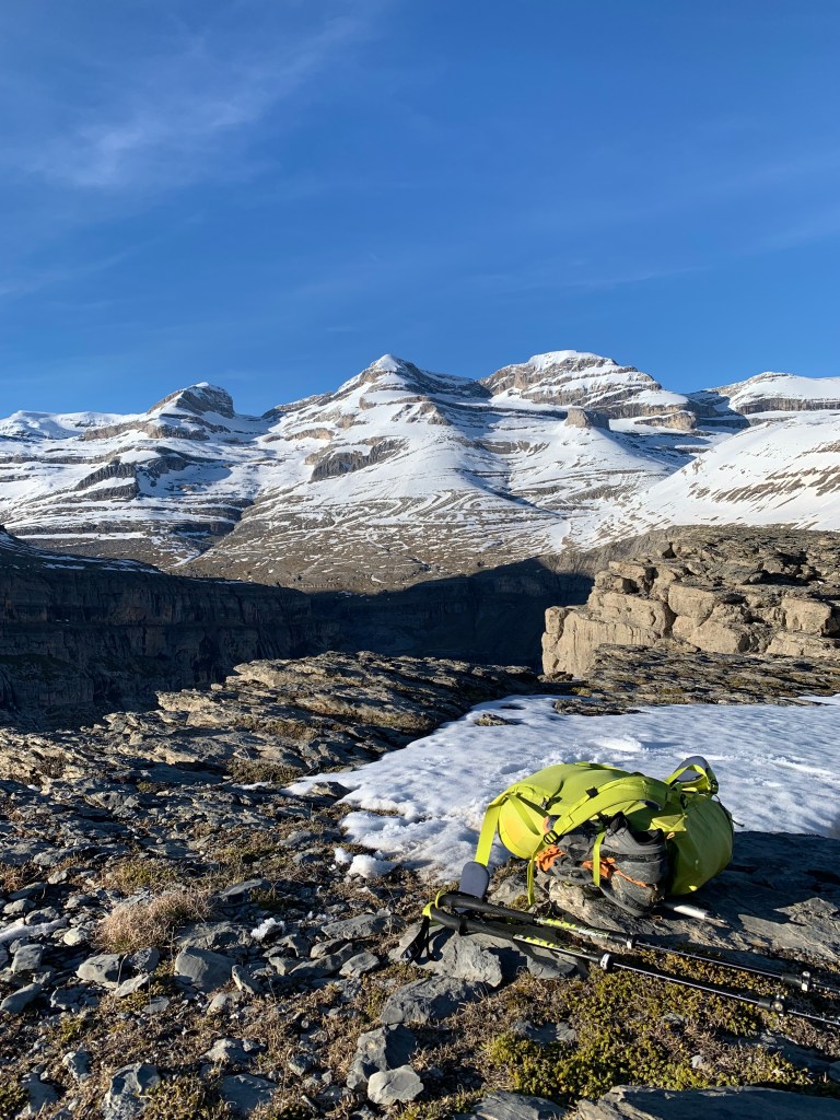 Cuello Arenas es el punto de paso para entrar en Ordesa, pero esta muy lejos todavía , ya que este cartel está solo saliendo de Nerín. El Mondoto, encima del Cañón de Añisclo queda para otro dia. Con estas cuestas y la temperatura, la sudada esta asegurada, parece verano, me replanteo el tema equipo invierno, tema agua? seguir el camino, subir poco a poco colocandome bien la mochila que me tira para atrás.La Peña Montañesa, a la me gustaría ir próximamente, me observa al fondo del Valle de NerinLlegando a Cuello Arenas, por un último trozo de pista, aquí me acerco al pequeño refugio que hay en el llano, cerrado. donde hago una buena parada, mochila fuera! como pesa! la camiseta, aunque técnica, esta empapada, beber! aquí ya cambia la sensación, hay algo de aire, ya no hace calor, debo de estar cerca de los 2.000m. Me ha costado una eternidad llegar hasta aquí, pero ya he entrado en el reino de la alta montaña!Para llegar a Cuello Gordo atravieso algunos campos de nieve blanda debajo de la vertiente norte del Pueyo Mondiceto 2.382m , el sueño podía haber sido también un vivac en su cumbre pero estoy rendido y además la nieve está muy blanda por la subida de temperaturas.He llegado, y la mochila también, Cuello Gordo, al borde del cañón de Ordesa abajo ya en sombras!Ordesa mirando hacia el oeste con la Faja de Pelay , a la izquierda, cubierta de nieveEl sol cae sobre OrdesaAprovechando que queda luz preparo unos «magníficos» nudles picantes para recuperar