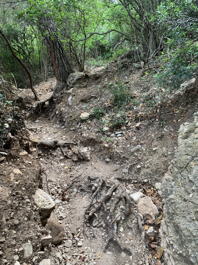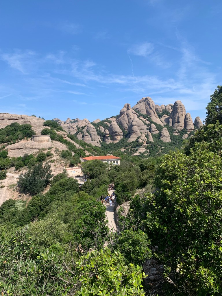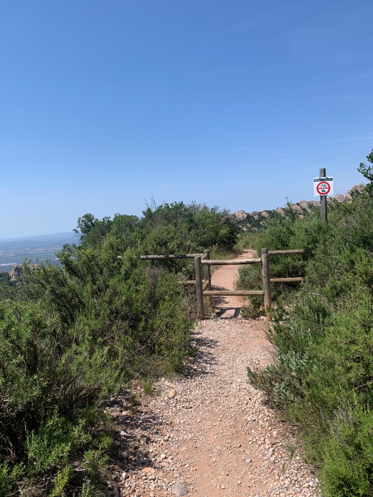 Aqui tengo un duda, para ir a enlazar y volver por el Camino de las Baterías hay que tomar el camino turístico hacia el Monasterio? eso hago, pero al cabo de un rato de bajada no lo veo claro y vuelvo a San Joan (sigue llegando gente en el funicular) . Le doy un vistazo al mapa, claro hay que bajar un poco mas y en el primer cruce tirar hacia la derecha. He perdido un buen rato y el calor aprieta, vamos!