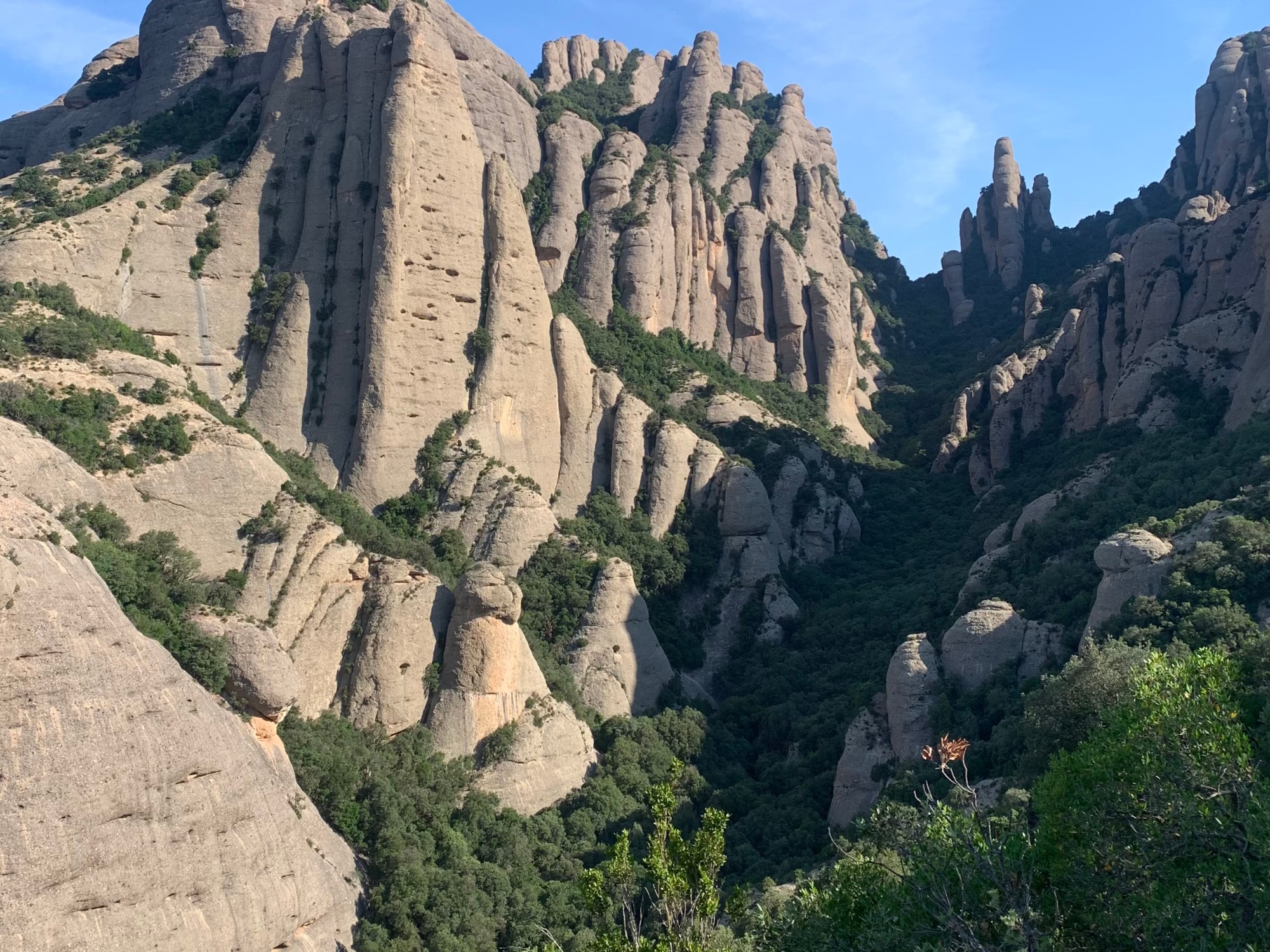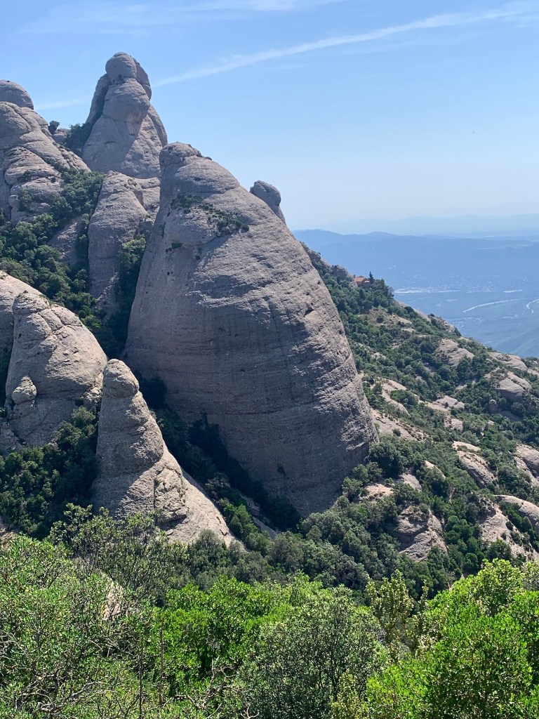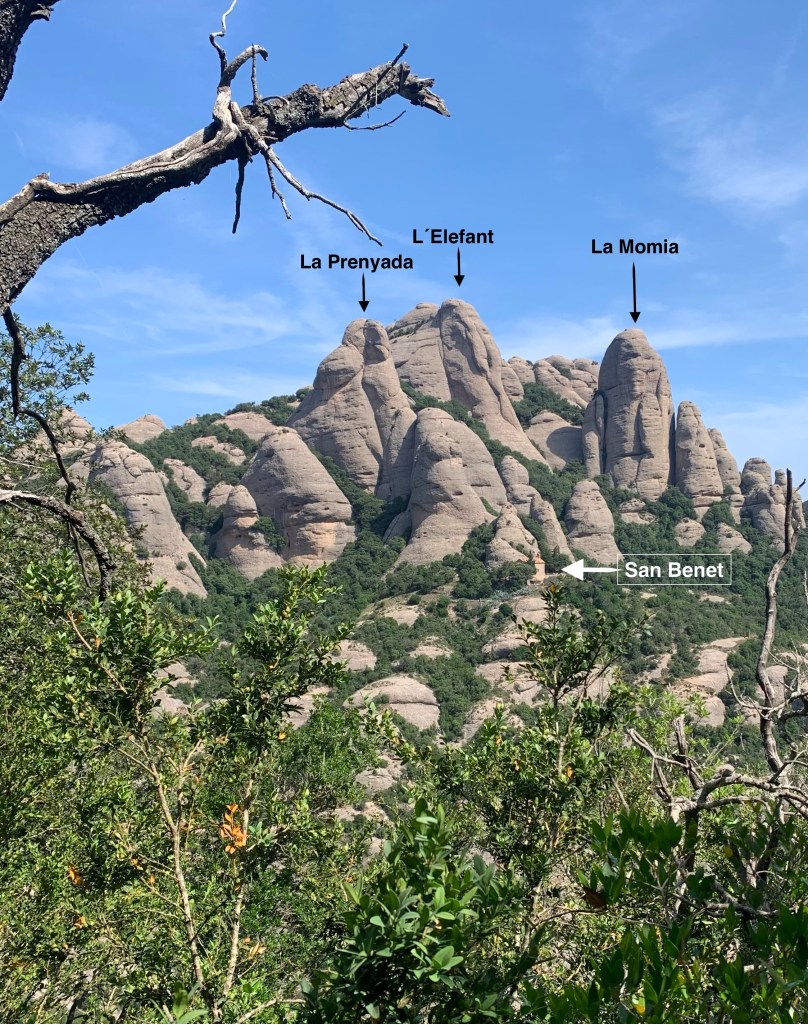 Ya en ruta hacia la estación superior del funicular de San Joan aparecen grandes clásicos de la escalada en Montserrat. El primero y más simbólico, el Cavall Bernat, en una vista posterior, por delante, por el norte, casi triplica su altura. (Ver escalada por la vertiente norte en el siguiente enlace si apetece)https://wordpress.com/post/mickylopez.net/1519