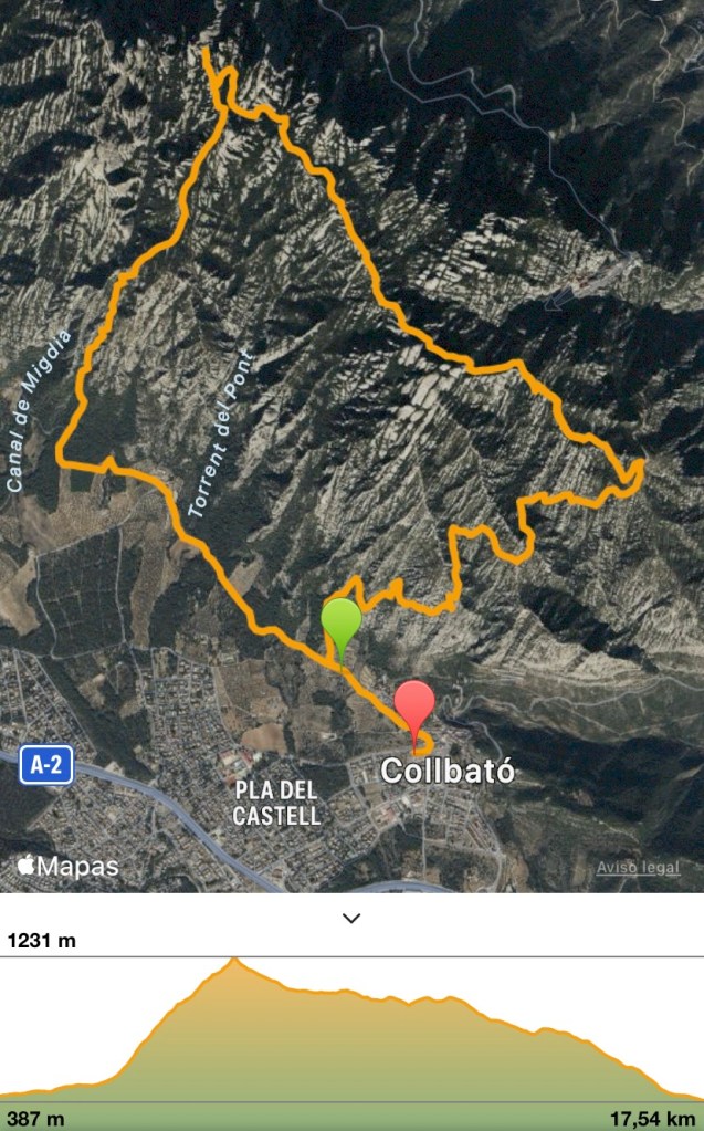 Una circular en Montserrat, ir temprano para evitar en lo posible el calor que, ahora si, ya está haciendo. Mapas, posibilidades, tratándose de Montserrat y lo «perdedor» que puede ser su escarpado terreno fuera de los caminos mas visitados, decido asegurar la jugada. Ya lo tengo: salir desde el pueblo de Collbató en el sur, subir por el Camino de los Franceses hasta la cumbre del macizo, San Jeroni, a 1.236m, para después cruzar hasta la estación superior del funicular de San Joan sobre el Monasterio y volver a Collbató por el Camino de las Baterías, total unos 17Km aprox.