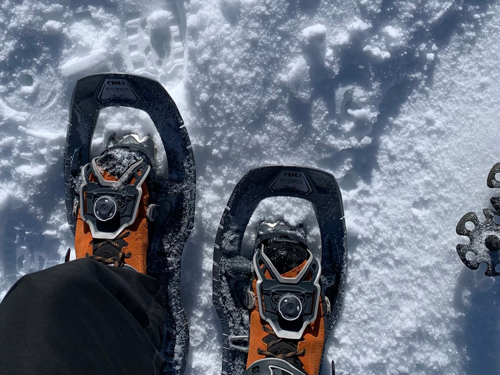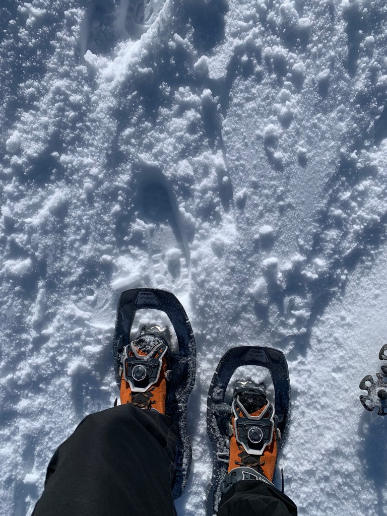 Es curiosa la sensación, las piernas han de ir mas separadas para no tropezar, me hundo un poco en la nieve no pisada pero nada que ver a ir solo con botas.