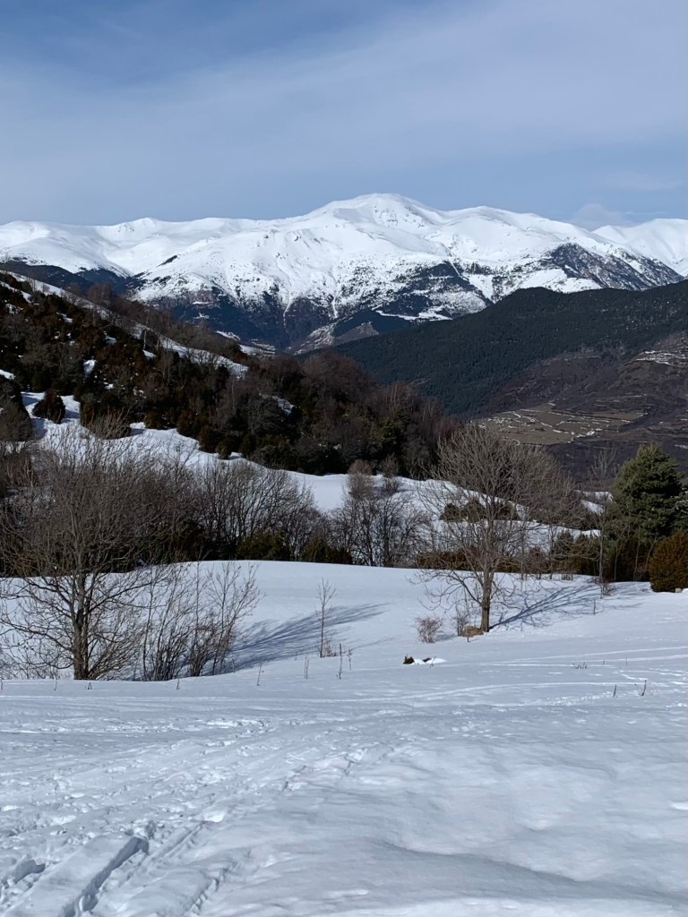 El día está precioso con algunas nubes altas y el paquetón de nieve le da a la zona una sensación de alta montaña. Para ser jueves hay gente en la ruta, sobre todo con esquís.