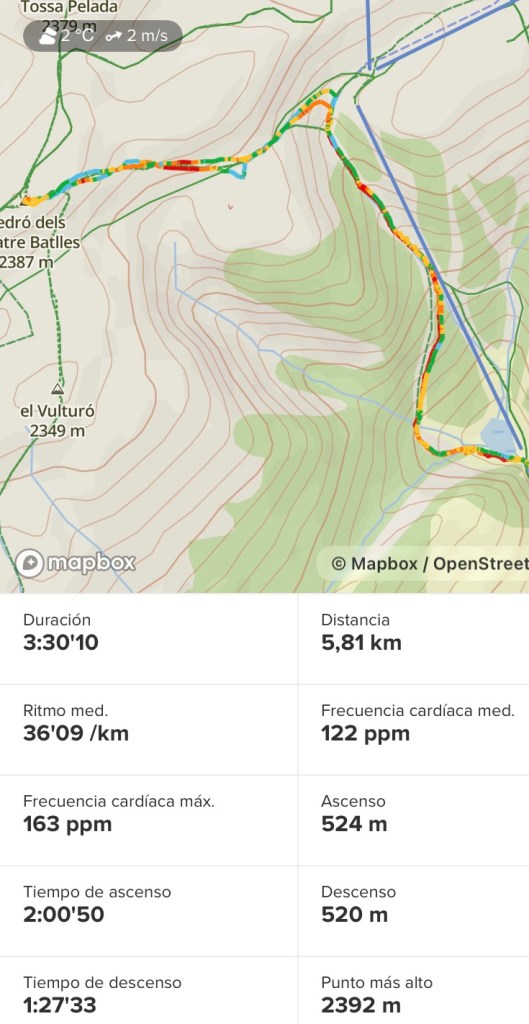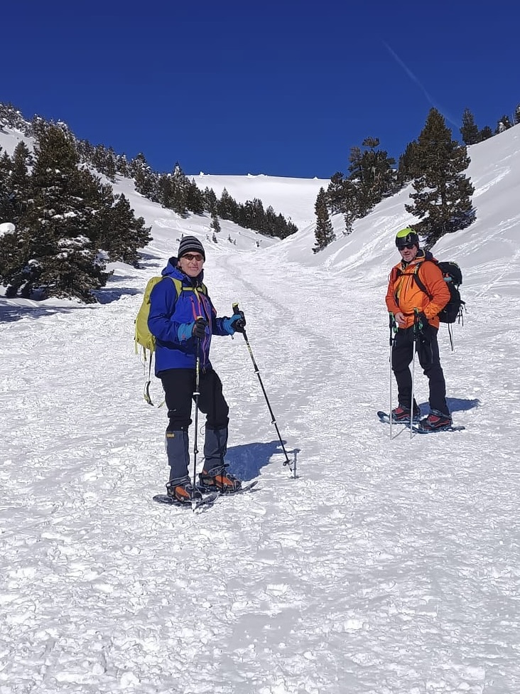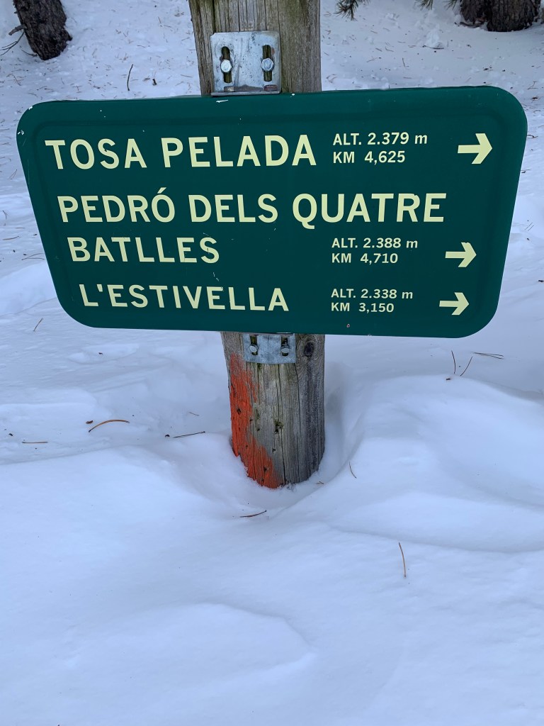 La ruta:datos básicosAl inicio del recorrido, por sombra con mucho frio. Foto: Genís RodriguezAhora, al solito, mejor! Foto: Genís RodriguezPobre arbolito de 3 metros casi desaparecido! Es impresionante la cantidad de nieve que hay!Un descanso en el camino, Foto: Joan CalvetNo es mucho desnivel, unos 500 m aprox. pero hay que subirlos! Foto: Joan Calvet Paisaje invernal , con árboles cubiertos de nieve y un cielo despejado.Cumbre! Pedró dels Quatre Batlles, 2.388m.